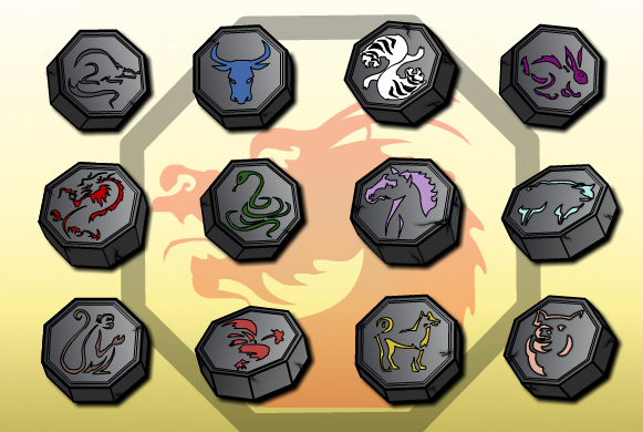 Талисман Петуха — левитация. Талисман Быка — суперсила. Талисман Змеи — невидимость. Талисман Овцы — управление астральной проекцией. Талисман Кролика — суперскорость. Талисман Дракона — управление огнём и усиление огня. Талисман Крысы — позволяет оживлять неодушевленные предметы в виде людей и животных (например, игрушки, статуи). Талисман Лошади — исцеление ран и болезней. Талисман Собаки — бессмертие, омоложение, пользователь чувствует себя моложе и сильнее. Талисман Свиньи — воспламеняющий взгляд это макса. Талисман Обезьяны — превращает предметы и людей в животных. Талисман Тигра — равновесие между Инь и Янь, разделяет пользователя на две личности — один имеет лучшие качества, другой — худшие. Проще — добро и зло." (Также было бы прикольно если с талисманами также появился и сам Шендю который был превращëн в статую китайского дракона.)