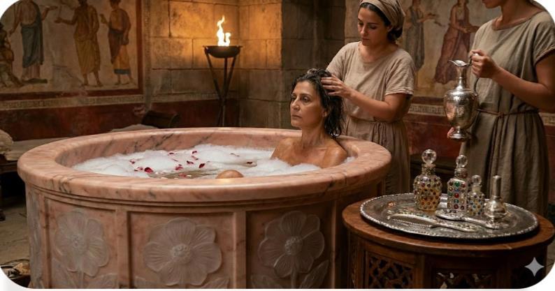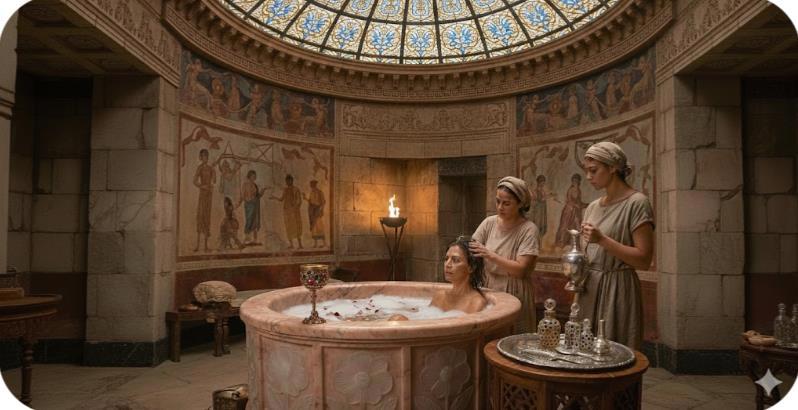 Автор щедро украшает дворец барельефами, мозаикой и остальными декадансными плюшками как то ванна, баня и бассейн :). Ха, это идея воспроизвести героя в окружении обнаженных жриц и партийцев :)