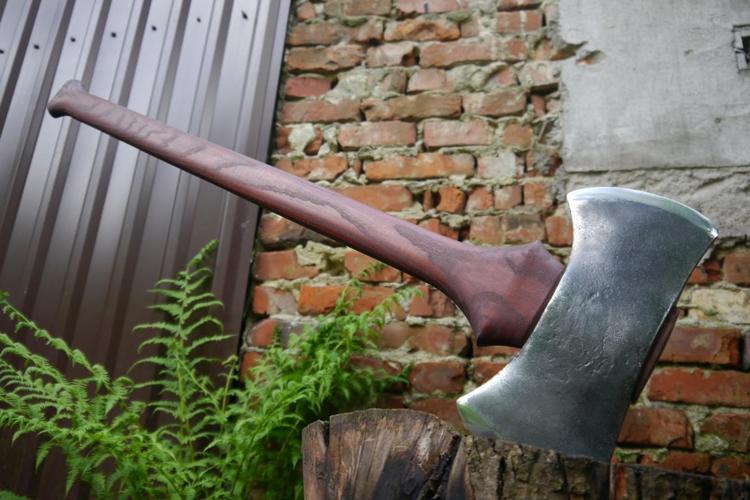 Попридираюсь немного. Колун которым орудует дядюшка по идеет штука односторонняя и тупая. Поэтому при нормальном хвате вонзить его в затылок себе затруднительно. А вот двусторонний лесорубный топор типичный для тех краев и эпохи - тут запросто. И на секиру он похож сильнее чем колун.