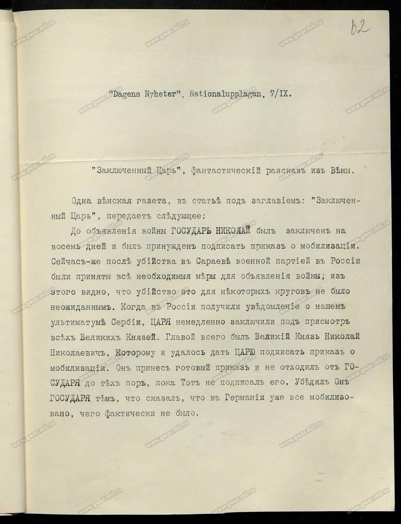 До объявления войны ГОСУДАРЬ НИКОЛАЙ был заключен на восемь дней и был принужден подписать приказ о мобилизации. Сейчас же после убийства в Сараеве военной партией в России были приняты все необходимые меры для объявления войны; из этого видно, что убийство это для некоторых кругов не было неожиданным. Когда в России получили уведомление о нашем ультиматуме Сербии, ЦАРЯ немедленно заключили под присмотр всех Великих Князей. Главой всего был Великий Князь Николай Николаевич, Которому и удалось дать ЦАРЮ подписать приказ о мобилизации. Он принес готовый приказ и не отходил от ГОСУДАРЯ до тех пор, пока Тот не подписал его. Убедил Он ГОСУДАРЯ тем, что сказал, что в Германии уже все мобилизовано, чего фактически не было.