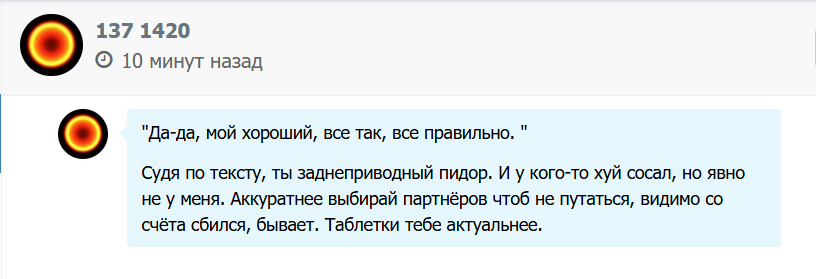 Он еще вот так в личку пишет. Там адекватностью не пахнет. Прошу прощения, что вам отвечаю, но он меня в игнор-лист кинул и прокомментировать его я больше не могу.