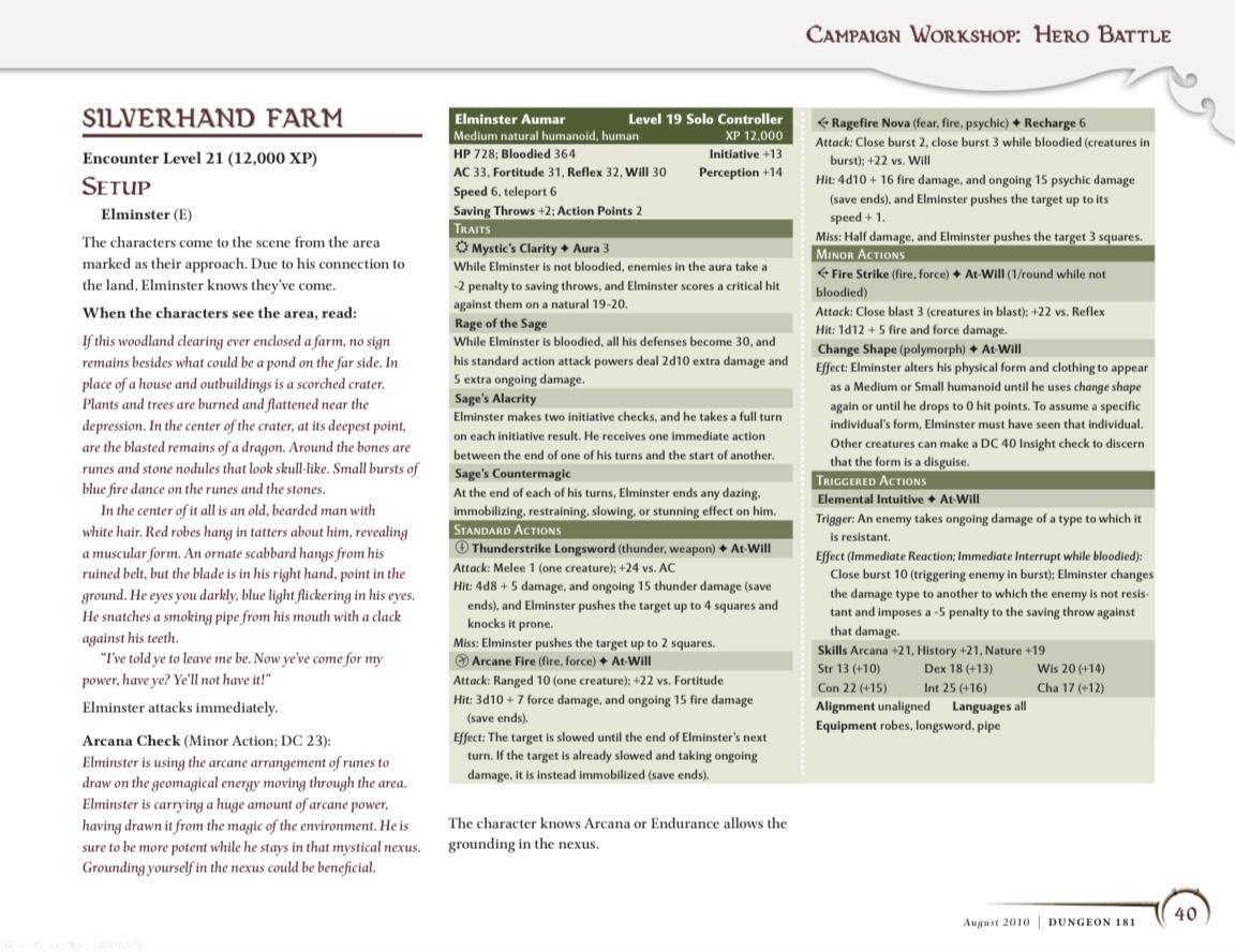 Special Qualities: Archmage High Arcana: Arcane reach, mastery of counterspelling, mastery of elements, spell power +4 (total). Chosen Immunities: Elminster is completely unaffected by attacks that duplicate these effects: detect thoughts, disintegrate, Evard's black tentacles, feeblemind, finger of death, fire ball, magic missile, sunburst, time stop. Chosen Spell-like Abilities (all 1/day): dispel magic, lesser ironguard, see invisibility, shapechange, Simbul's synostodweomer (converts prepared spells into 2 points of healing per spell level), spider climb, teleport without error, thunderlance, true seeing. Detect Magic (Su): Line of sight. Enhanced Constitution: The Chosen of Mystra template adds +10 to Elminster's Constitution. Enhanced Intelligence: Elminster used wish spells to increase his Intelligence. His Intelligence score has a +4 inherent bonus included in its value. Epic-Level Benefits: Bonus spell level x4 (included in the listing below), six effective levels of wizard and five of archmage (included in above total} Silver Fire (Su).