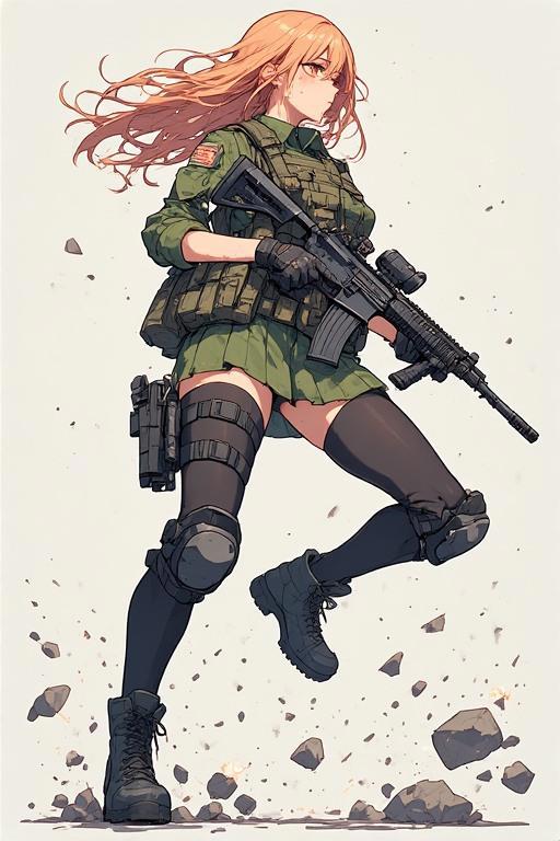 A stunningly detailed anime-style female soldier in a high-octane combat scene, her curvaceous figure clad in a sleek tactical ensemble—a form-fitting military top with a short, flared skirt, thigh-high stockings, and rugged combat boots. Her gear is meticulously rendered: a loaded assault rifle slung across her chest, a tactical harness packed with ammo pouches, and a dynamic, mid-action pose that sends her long, windswept hair flying as she pivots on one boot. The background explodes with chaotic energy—shattered concrete, muzzle flashes, and debris frozen in time—all rendered in the hyper-stylized, jagged-edge aesthetic of *Chainsaw Man*, blending grit with surreal vibrancy. Every stitch, shadow, and gleam of sweat is razor-sharp, making her lethal grace pop against the carnage.