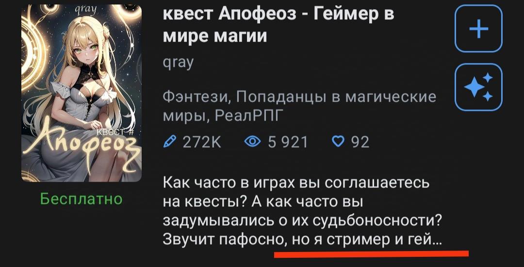о, привет. нет, я даже рад, что ты написал под моей книгой (знаком с тобой ещë с комнаты аюны). это будет кощунство – кидать такого заинтересованного читателя в чс. мне лично всë равно, но многих писателей демотивируют комменты по типу "когда прода?". расскажу свою историю. давным-давно у меня была одна любимая книга про "девочку" с крыльями на рулате – я постоянно написывал автору в ожидании продолжения и в один момент сильно перегнул палку (нашëл его в вк и стал задалбливать уже там). в итоге человек после этого навсегда бросил писать и от него нет ни прод, ни новых книг более пяти лет