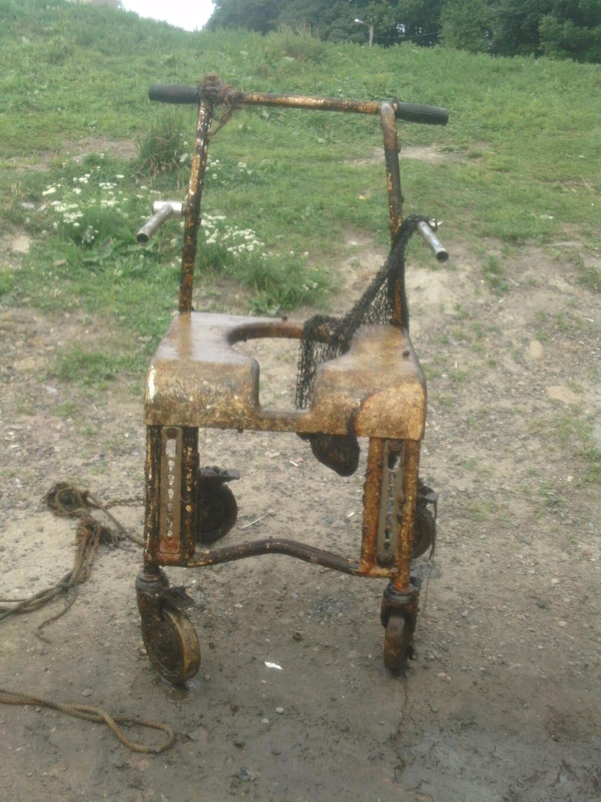 А я как то из Невы вот такую "санитарную принадлежность" выловил, причём кроме планок для фиксации ног, был ещё очень толстый ремень с мощной пряжкой в районе пояса (к сожалению оторвался при подъёме), ну и отверстия на подлокотниках намекают на то что ещё и локти с кистями фиксировались.
