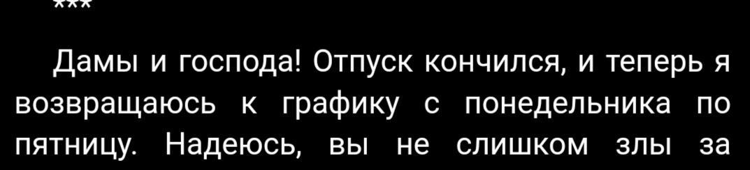 Мда.... Жестоко вы конечно с нами, читателями обошлись. Такую интригу вывели, а ее разрешения теперь ждать придётся долго... Нам же теперь эта неделя вечностью покажется)) Требую дополнительную проду!!! ( шучу конечно). На самом деле очень занемательный поворот сюжета. Причем в любом из вариантов: при положительном исходе-интересен сам способ выхода из ситуации, а вот если гг погибнет, то тут вообще будет уникальный сюжет))( я по крайней мере ещё не встречала на просторах интернета ничего похожего). Ладно что-то увлеклась я фантазиями. Оставлю это дело профессионалу - то есть автору.