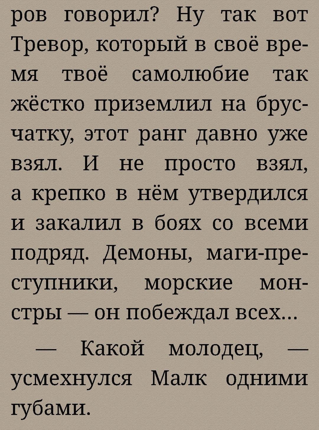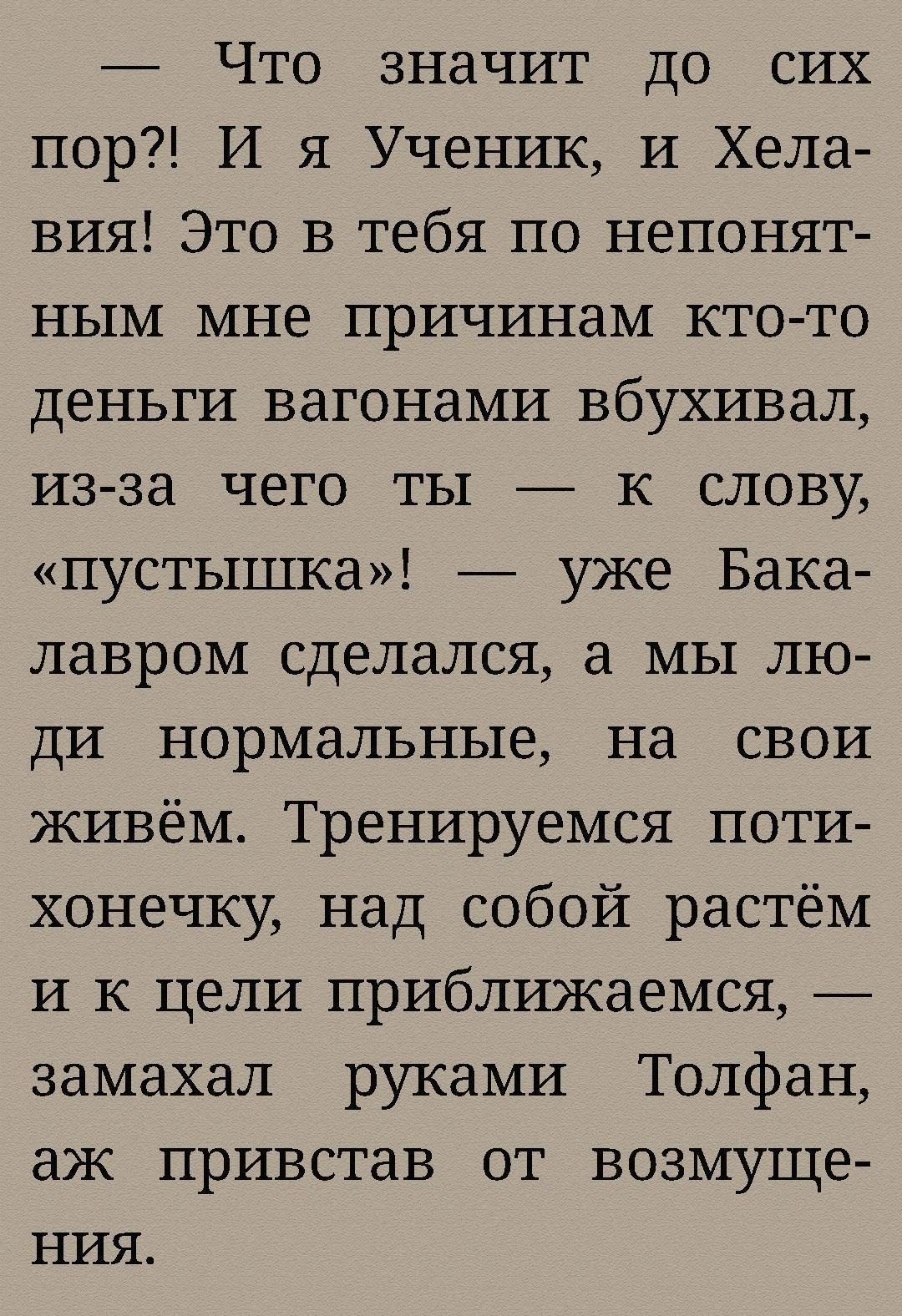 Когда Виталий анонсировал варианты названия главы, одино из них было про катализатор. Похоже Малк случайно сделал из проклятого ножа катализатор, который во время медитации изменяет его физическое тело, придавая ему сродство со смертью. И если это так то Малк становится практически младшей копией Тияза - у обоих осталось только сродство духа и тела со смертью. А это значит на Малке можно пробовать эксперементальные методики развития.  А за одно Тиязу будет проще развивать Малка, так как сам уже прошел этот путь.