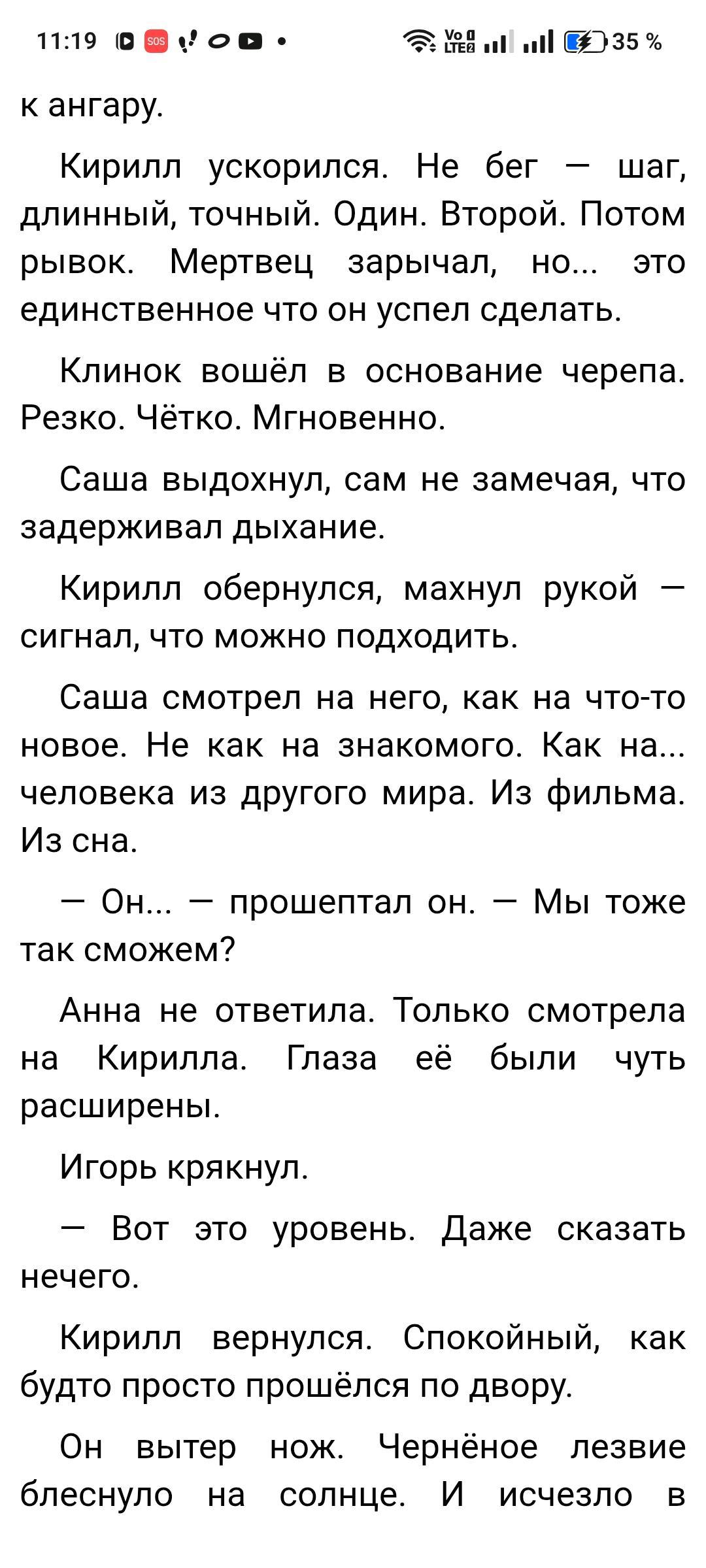 Да и, может быть, ещё сам жанр подвёл. Я не был бы столь Возмущён не соответствием текста и жанра, если бы это было, например. Социальная морально-нравственная философская история с элементами зомби апокалипсиса. Ну нет, тут заявлено чётко: риал РПГ.я читаю её, как приключенческую литературу, а попадаю. В неуёмный пафос и Уже надоевшую саморефлексию на пустом месте.