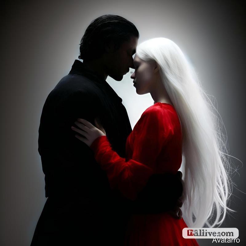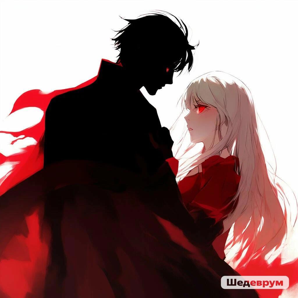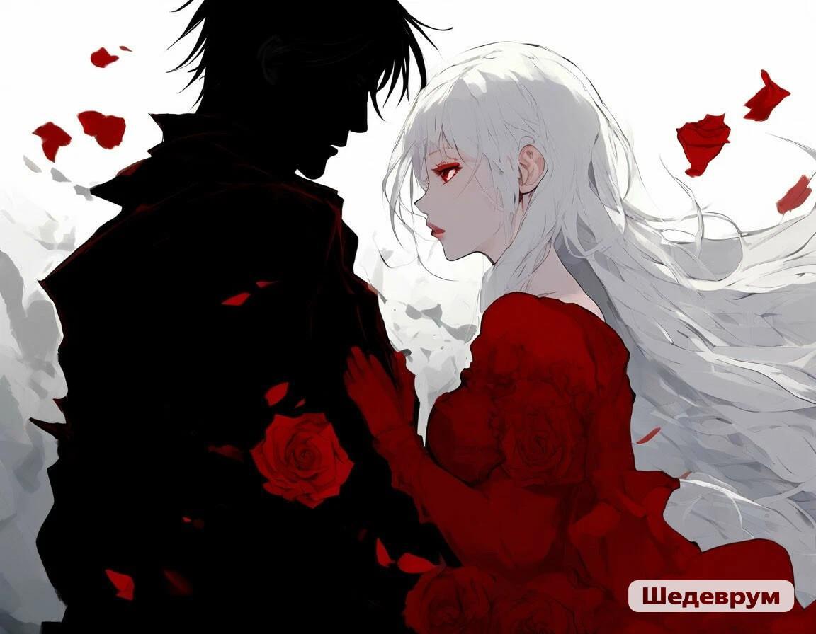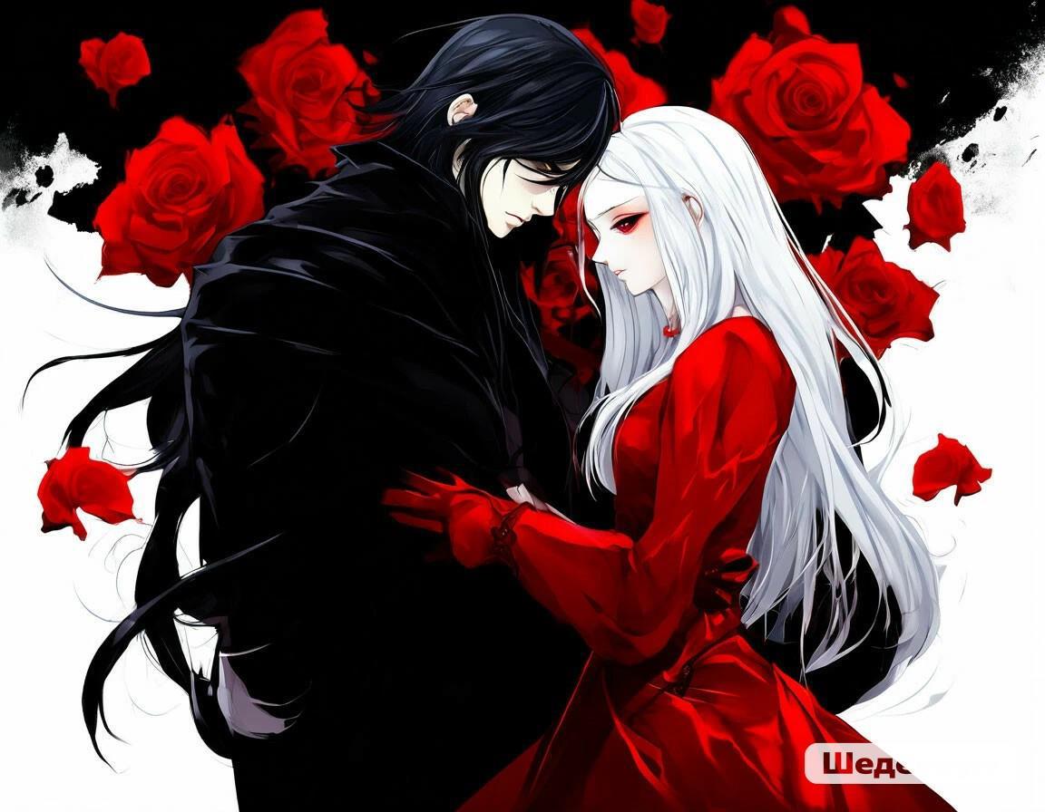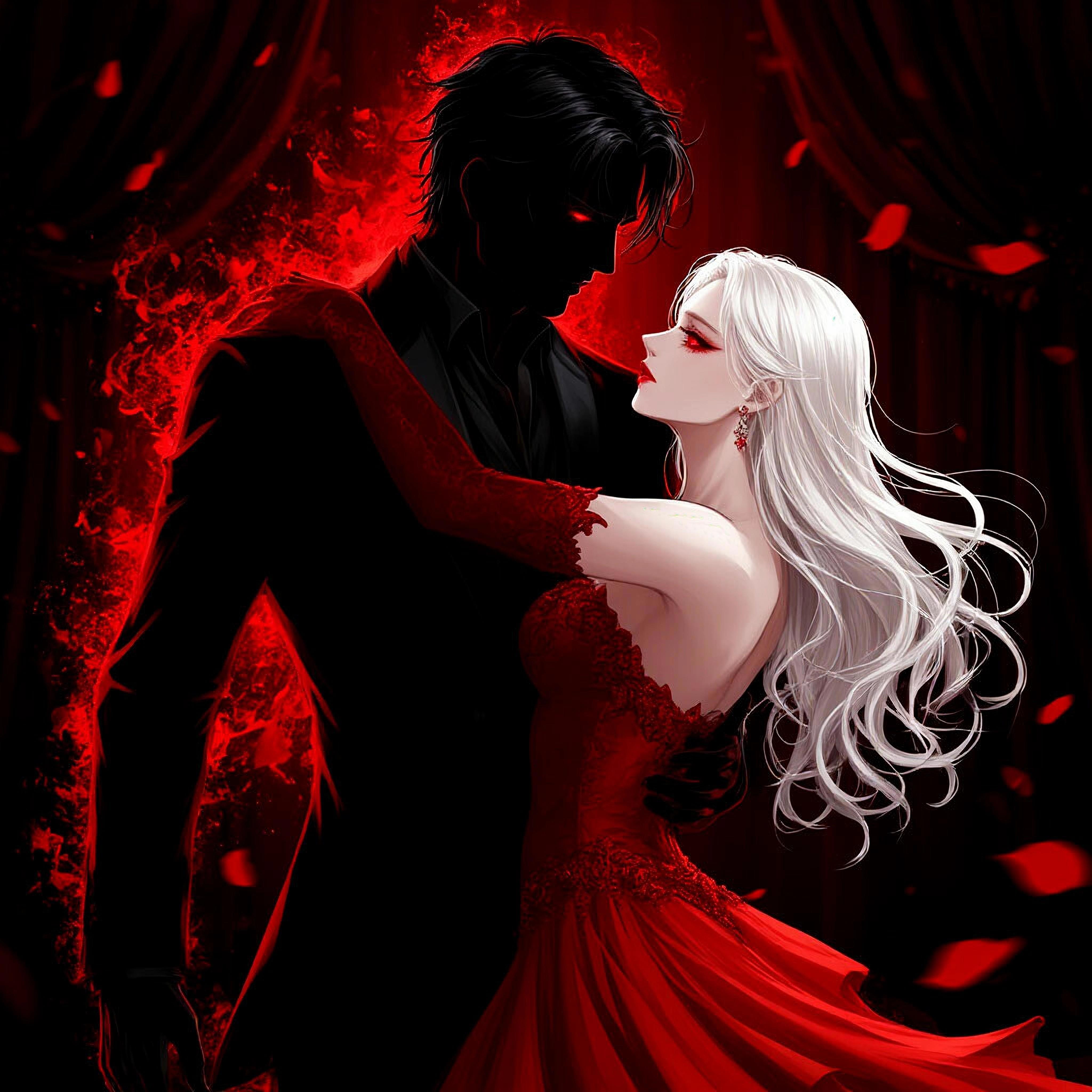2D рисовка. манхва стилистика. чёрный фон. бальный зал фон. алыми розы фон. силуэт мужчины полностью окутанные мраком. мужчина брутален. мужчину покрывает багровая аура. у мужчины чёрные волосы. у мужчины чёрные глаза. мужчина танцуют танго с девушкой. у девушки красные глаза. девушку-альбиноску. волосы девушки белоснежные, длинные, распущенные. девушка танцует танго с мужчиной. девушка одета в ярко красный платье.