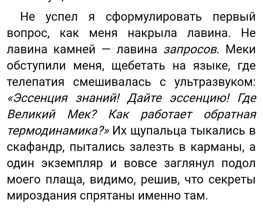 Дело в том что я тоже работал с ботами, просил их написать определённые сценарии или описание существ. И то что увидел в этой книге по структуре соответствует тому что мне выдавали боты. Также на это указывает повторение одного и того же текста разными словами с небольшими корректировками, это выглядит как будто бота просили переделать выданный им текст с определёнными корректировками, но почему-то при составлении текста скопировалось оба варианта. Есть моменты где бот как будто не до конца понимает о чём пишет, например как в приложенном скриншоте. 👇(у него точно нет никакого скафандра или плаща, человек-автор — такой  бред  точно бы не написал)