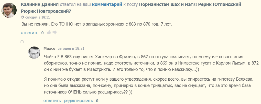 Всегда интересно смотреть на три вещи: как горит огонь, как течет вода, и как норманисты бьются с антинорманистами над вопросом, который в академической науке не стоит уже лет эдак двести...)) Просто потому, что нормальным историкам абсолютно наплевать кем Рюрик был "по национальности"...)) Им, конечно, интересен сам факт, но кем бы он не оказался - они вообще никак не расстроятся, несмотря на то, что поголовно являются наймитами Романовых и воспитанниками немецких гастарбайтеров, переписавших нашу историю...))