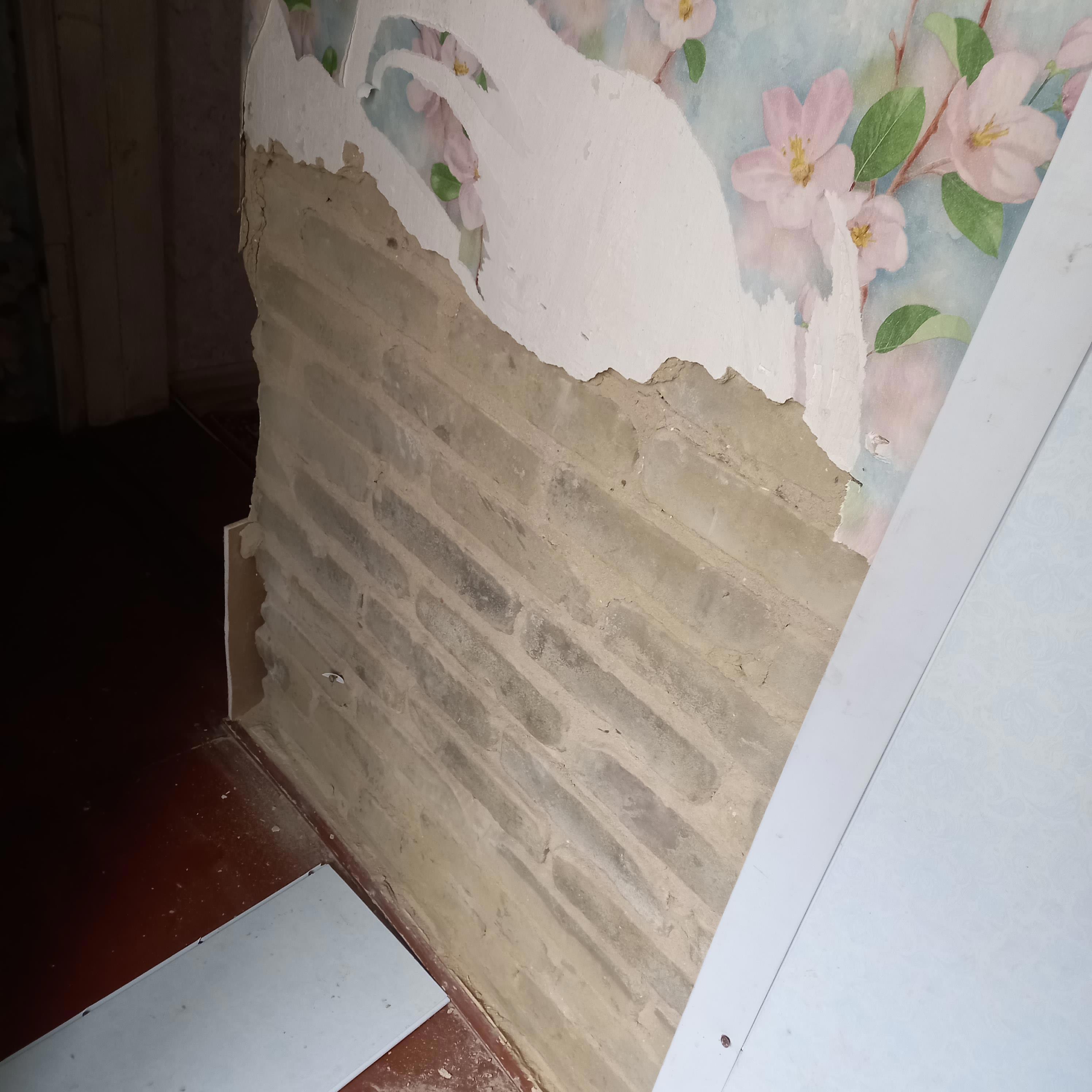 Купили дом, ремонт ещё не везде сделали, но сын (1,5 г.) помогает, как может. Вот в коридоре обвалил полстены штукатурки.