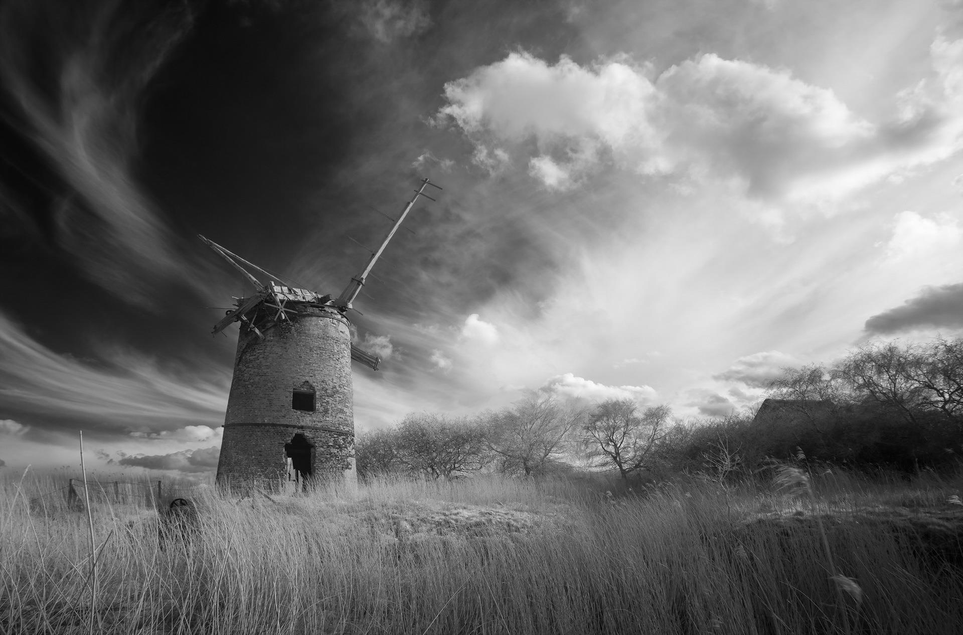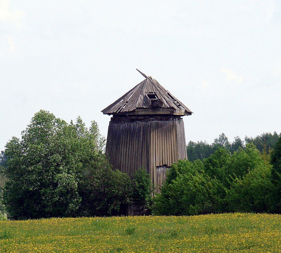 Только без крыши и каменная. Чуть возвышается над вековым лесом и больше даже не ветряная я с водяным сломанным колесом.... Искал но так и не нашел что именно вижу когда читаю.....