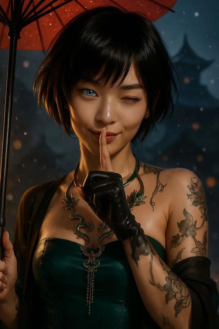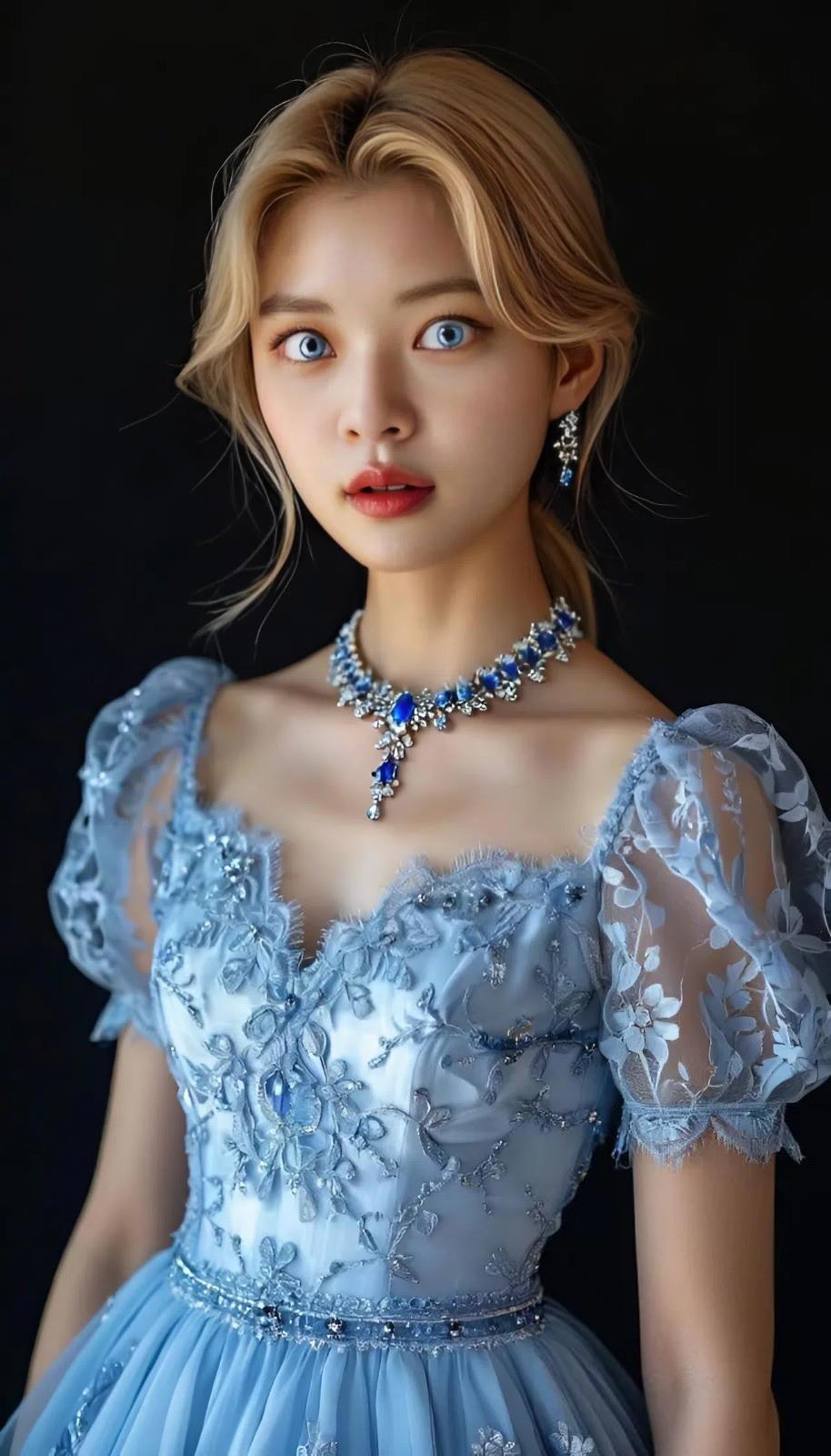 ЮнМи — в платье из нежно-голубого кружева с подкладкой из белого шёлка, короткими рукавами-фонариками и пышной юбкой, собранной на талии. Длина — до середины икр. По краям кружева вплетены нити с микрокристаллами, которые рассеивают свет, создавая паутинку бликов, будто это бриллианты. На её шее — ожерелье «Aurora Collection» ювелирного дома «Harry Winston», состоящее из 127 бриллиантов и 15 голубых сапфиров общим весом в 24 карата, расположенных в виде звёздного неба.