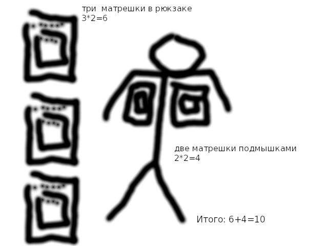 2 матрёшки малый+большой подмышками и 3 в рюкзаке .- вот и 10.