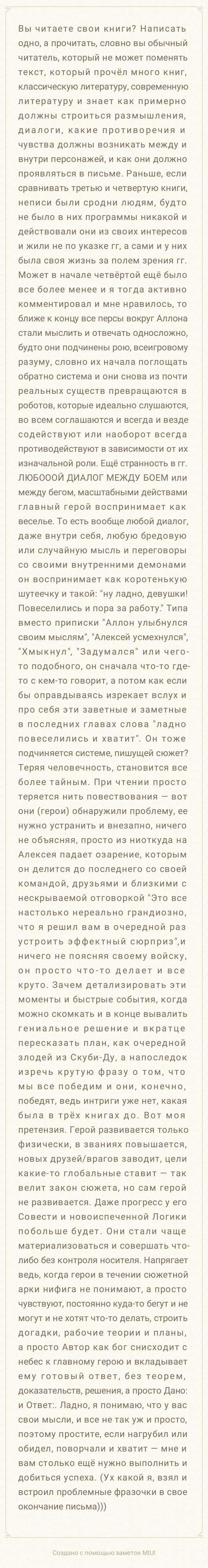 Вы читаете свои книги? Написать одно, а прочитать, словно вы обычный читатель, который не может поменять текст, который прочёл много книг, классическую литературу, современную литературу и знает как примерно должны строиться размышления, диалоги, какие противоречия и чувства должны возникать между и внутри персонажей, и как они должно проявляться в письме. Раньше, если сравнивать третью и четвертую книги, неписи были сродни людям, будто не было в них программы никакой и действовали они из своих интересов и жили не по указке гг, а сами и у них была своя жизнь за полем зрения гг. Может в начале четвёртой ещё было все более менее и я тогда активно комментировал и мне нравилось, то ближе к концу все персы вокруг Аллона стали мыслить и отвечать односложно, будто они подчинены рою, всеигровому разуму, словно их начала поглощать обратно система и они снова из почти реальных существ превращаются в роботов, которые идеально слушаются, во всем соглашаются и всегда и везде содействуют или наоборот всегда противодействуют в зависимости от их изначальной роли. Ещё странность в гг. ЛЮБОООЙ ДИАЛОГ МЕЖДУ БОЕМ или между бегом, масштабными действами главный герой воспринимает как веселье. То есть вообще любой диалог, даже внутри себя, любую бредовую или случайную мысль и переговоры со своими внутренними демонами он воспринимает как коротенькую шутеечку и такой: "ну ладно, девушки! Повеселились и пора за работу." Типа вместо приписки "Аллон улыбнулся своим мыслям", "Алексей усмехнулся", "Хмыкнул", "Задумался" или чего-то подобного, он сначала что-то где-то с кем-то говорит, а потом как если бы оправдываясь изрекает вслух и про себя эти заветные и заметные в последних главах слова "ладно повеселились и хватит". Он тоже подчиняется системе, пишущей сюжет? Теряя человечность, становится все более тайным. При чтении просто теряется нить повествования — вот они (герои) обнаружили проблему, ее нужно устранить и внезапно, ничего не объясняя, просто из ниоткуда на Алексея падает озарение, которым он не делится до последнего со своей командой, друзьями и близкими с нескрываемой отговоркой "Это все настолько нереально грандиозно, что я решил вам в очередной раз устроить эффектный сюрприз",и ничего не поясняя своему войску, он просто что-то делает и все круто. Зачем детализировать эти моменты и быстрые события, когда можно скомкать и в конце вывалить гениальное решение и вкратце пересказать план, как очередной злодей из Скуби-Ду, а напоследок изречь крутую фразу о том, что мы все победим и они, конечно, победят, ведь интриги уже нет, какая была в трёх книгах до. Вот моя претензия. Герой развивается только физически, в званиях повышается, новых друзей/врагов заводит, цели какие-то глобальные ставит — так велит закон сюжета, но сам герой не развивается. Даже прогресс у его Совести и новоиспеченной Логики побольше будет. Они стали чаще материализоваться и совершать что-либо без контроля носителя. Напрягает ведь, когда герои в течении сюжетной арки нифига не понимают, а просто чувствуют, постоянно куда-то бегут и не могут и не хотят что-то делать, строить догадки, рабочие теории и планы, а просто Автор как бог снисходит с небес к главному герою и вкладывает ему готовый ответ, без теорем, доказательств, решения, а просто Дано: и Ответ:. Ладно, я понимаю, что у вас свои мысли, и вс