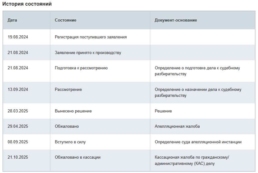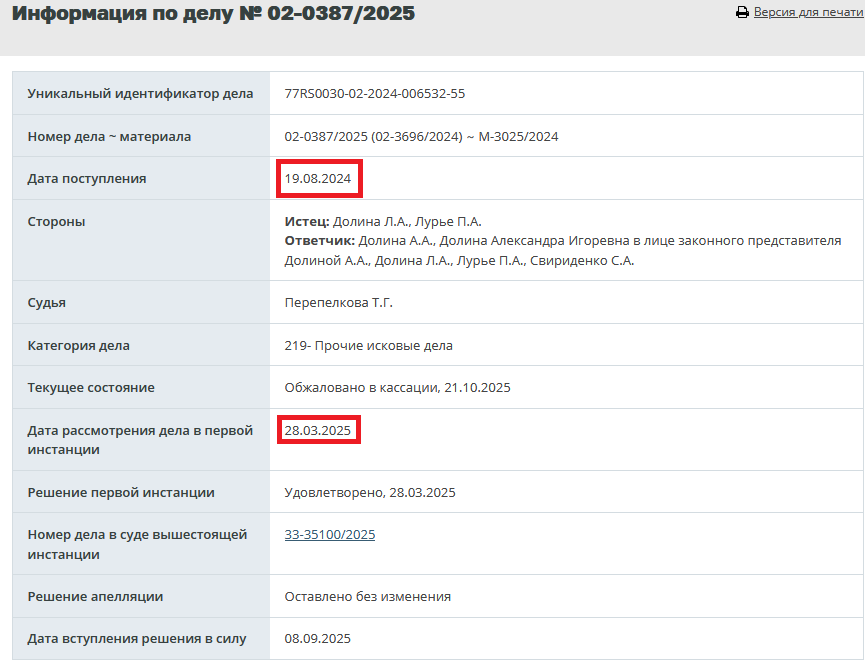 В суд Долина подала 19.08.24, рассмотрели первый раз - 13.09.24, решение вынесено - 28.03.25.