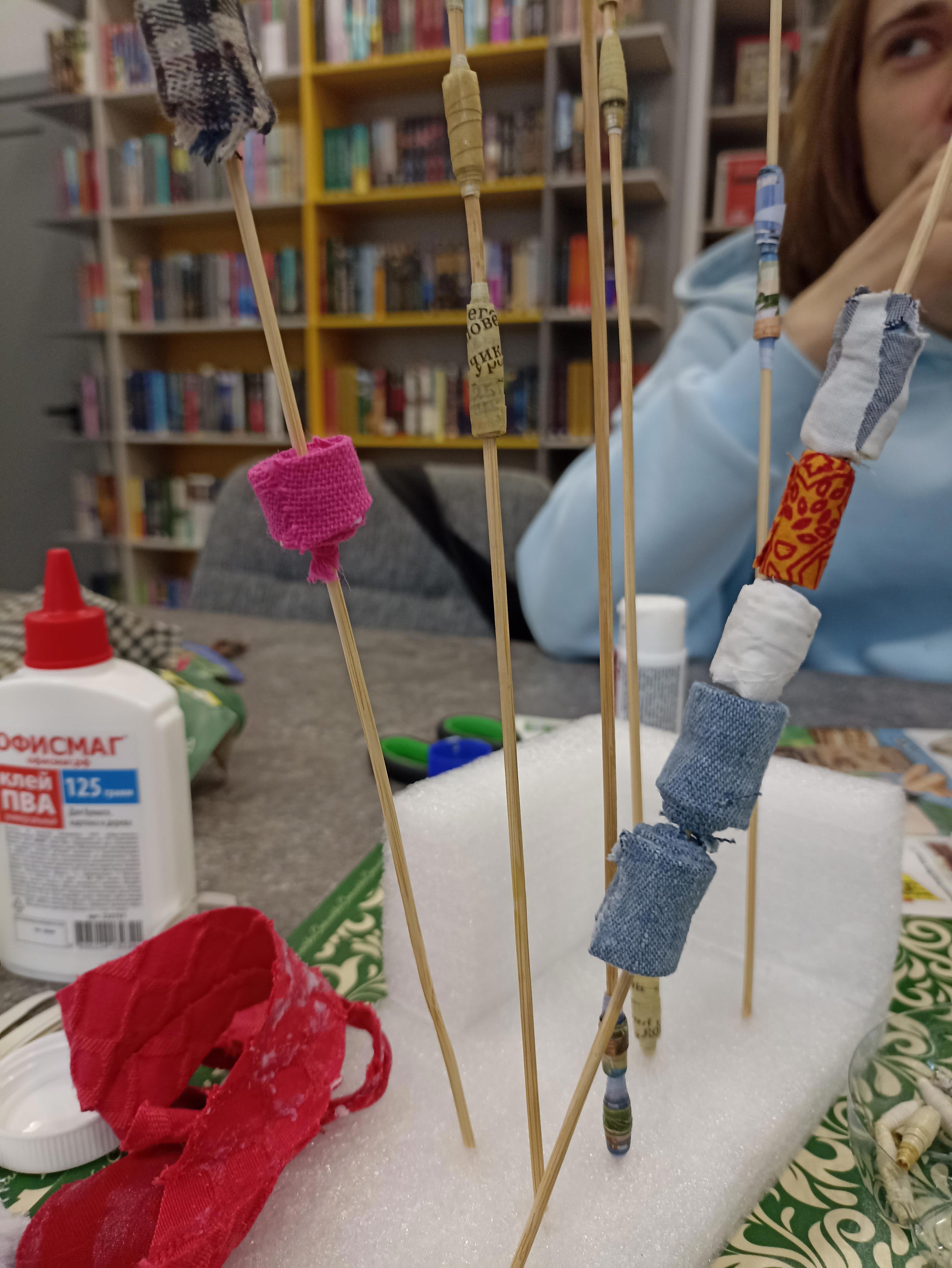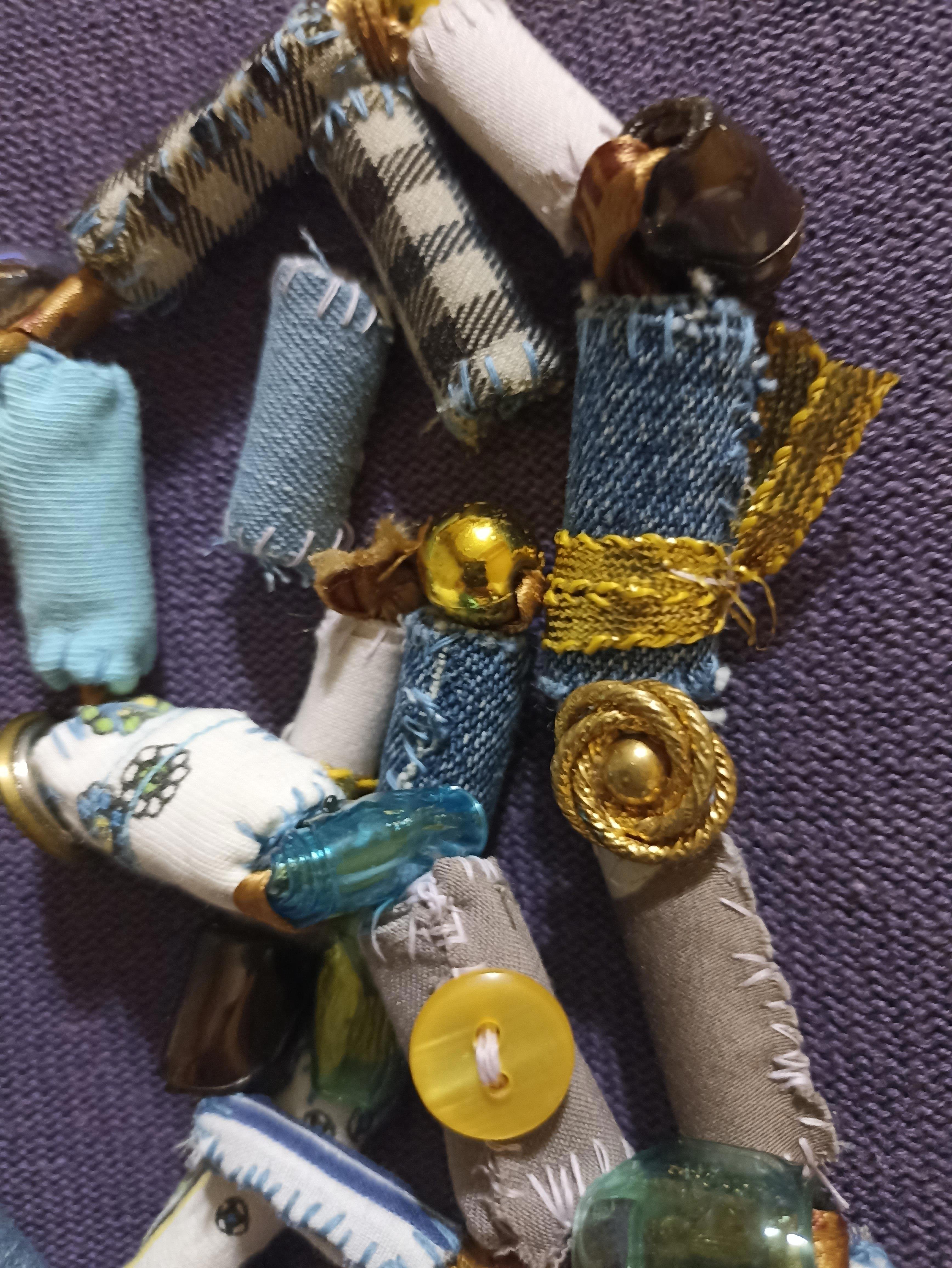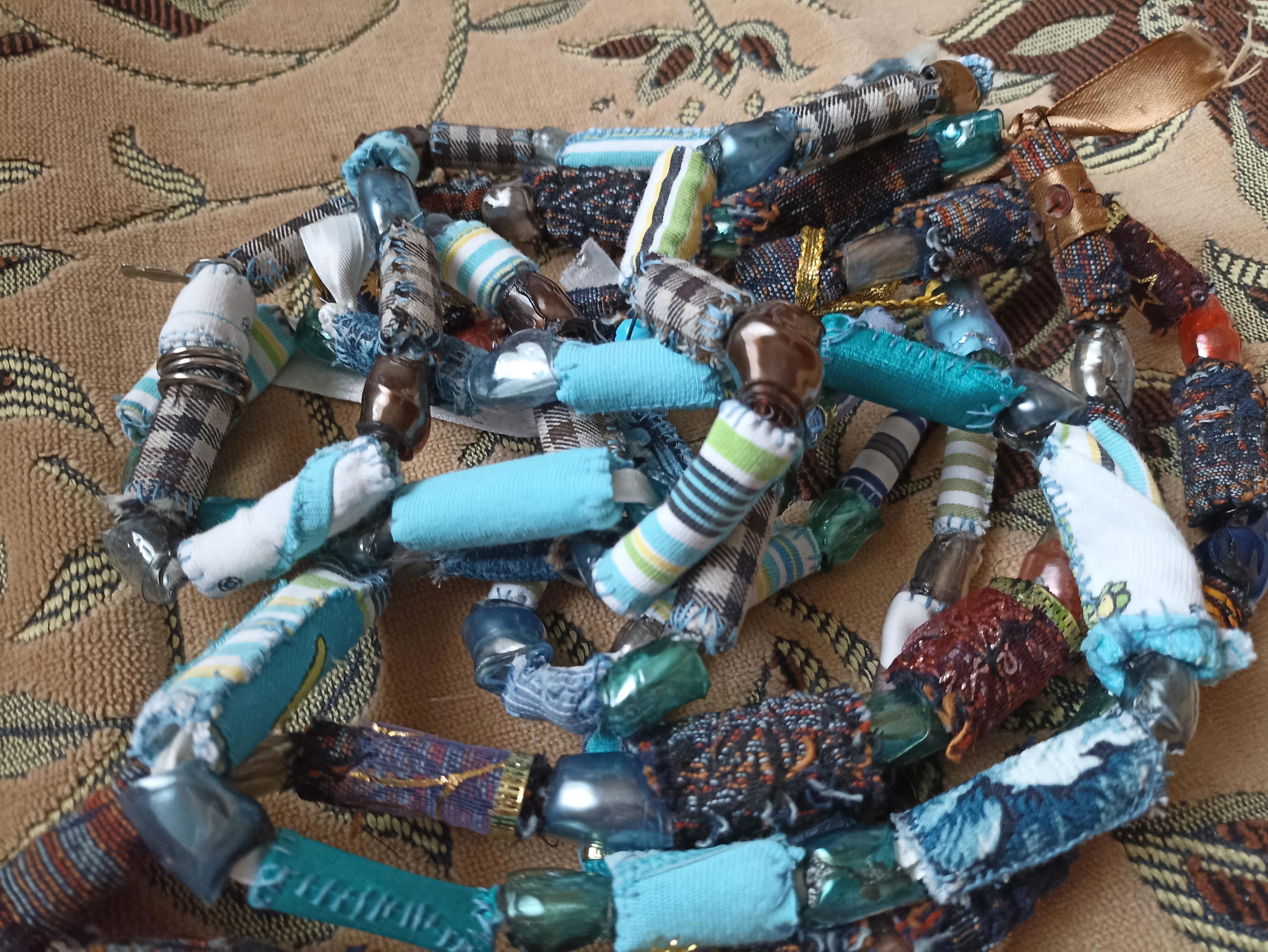 Шо по изготовлению текстильных бусин... Вообще технология проста: если это хлопок, то можно просто нарезать ткань на полоски, проклеивать ПВА и наматывать... вообще рекомендую на палочку для азиатской еды, чтобы дырка была побольше. Получится этакий рулет. Если это другая ткань, то тот же самый принцип, но надо прошивать.