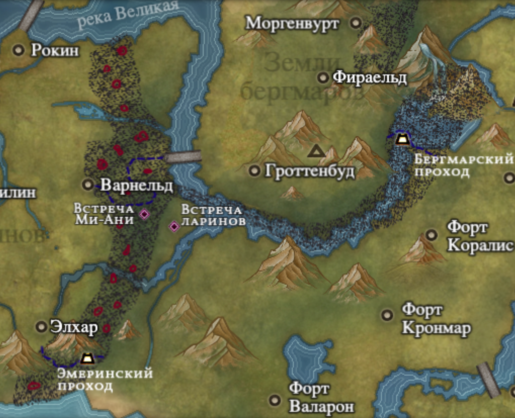 Первая карта - общий регион, вторая карта - кусок того, что Хейл узнает при допросе. Синий - проход в мареве, красный - "карманы" в мареве болота.