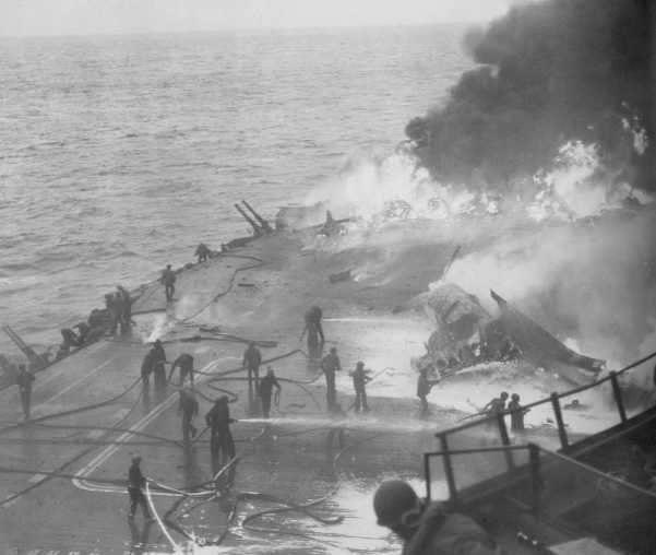 Что до пожаров и вторичной детонации, то же вполне возможно. Готовили к запуску самолеты, не слили с системы горючку, где то что то потекло сильно, после двух гостинцев, полыхнуло и привет. Опыта ВМВ ещё не было, стратегию тушения и локализацию пожаров авиа топлива не отработали, пожарники со шлангами от вторички полегли. Это все Лехин героизм "Слабоумия и Отвага", звёзды неудачно сегодня сложились с неубранными в ларек боеприпасами. Короче Мидуэй китайского разлива.