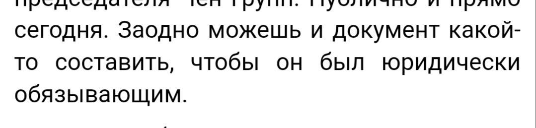 Возможно и так, но что мешает прописать обязательства сторон, сохранение текущего положения и возможный рост до зам председателя с одной стороны и поддержка в другой стороны, а в качестве штрафов над каждой из сторон лишение голоса и права управления над пакетом акций на определённый период, ну и как по мне, простые слова на конференции имеют меньше лигитимности и там проще отбрехаться от всех, как раз таки, вашими фразами, передумал или вскрылись новые обстаятельства и как по мне пресс релиз, сам по себе, мало что даёт