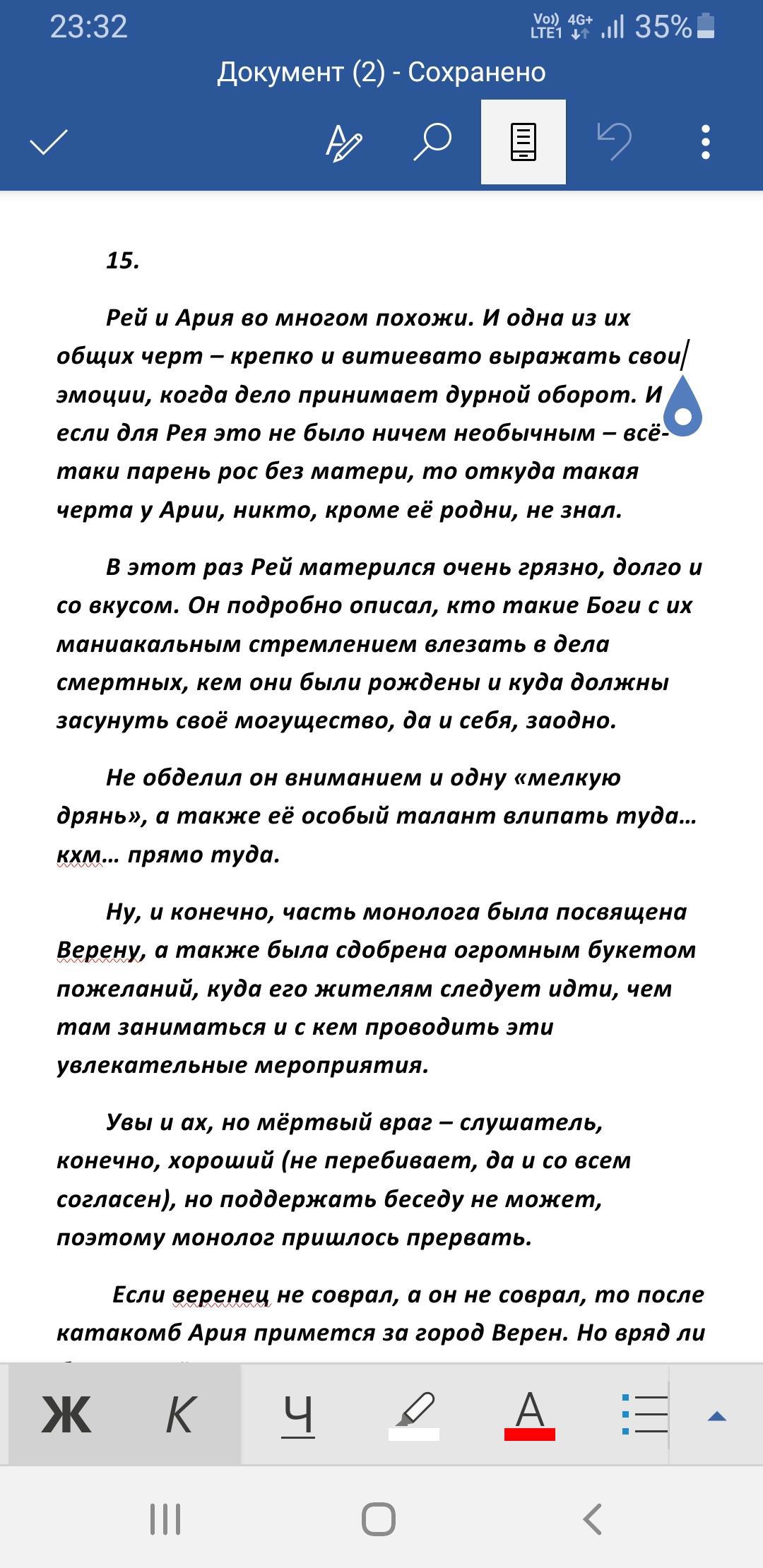 Я пишу книгу на смартфоне, новую главу "заливаю" в интернет текстом с помощью "копировать/вставить". Абзацы и красную строку делаю сразу и сразу стараюсь писать без ошибок, чтобы при чтении и редактуре перед выставлением новой главы мне оставалось исправить только то, что мешает по смыслу. Например, часто повторяющееся слово. Или могу исправить текст, если мне неприятно его читать, он как-то не звучит в голове (не знаю, как объяснить...)