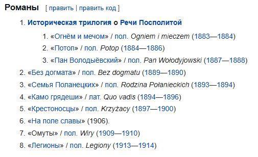ниже - для сравнения библиография Генриха Сенкевича, которому сложно отказать в звании писателя.