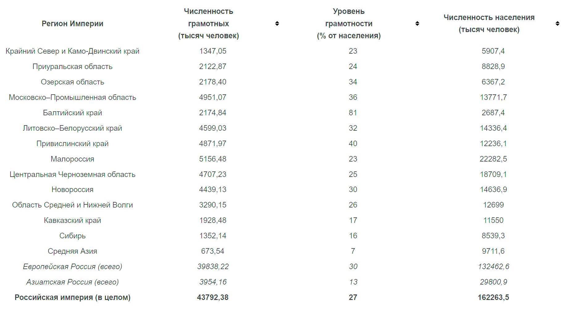 Однако имеется факт: процент грамотных в РИ считали и продолжают считать вместе с КОЛОНИЕЙ Кавказом , Сибирью и Средней Азией. Где грамотность была значительно ниже чем в метрополии. Балтийская область это в том числе столица -- грамотность вообще 80%.