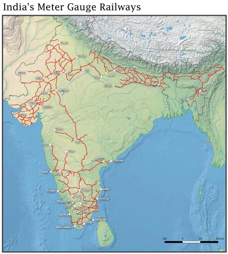 Первая узкоколейная железная дорога в Индии с колеёй 1000 мм (метровая колея) — это Gaekwar’s Baroda State Railway (GBSR). 1862 год между городами Dabhoi и Miyagam (в штате Гуджарат) Длина первого участка около 39 км (24 мили)