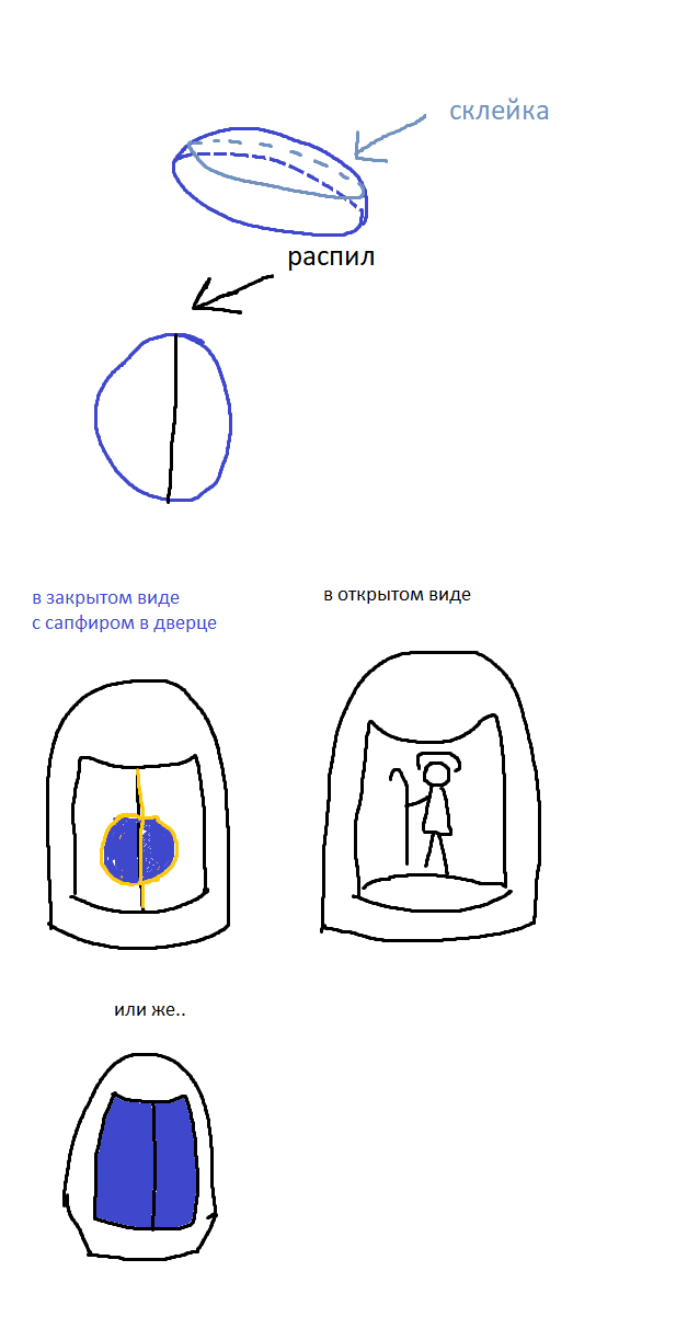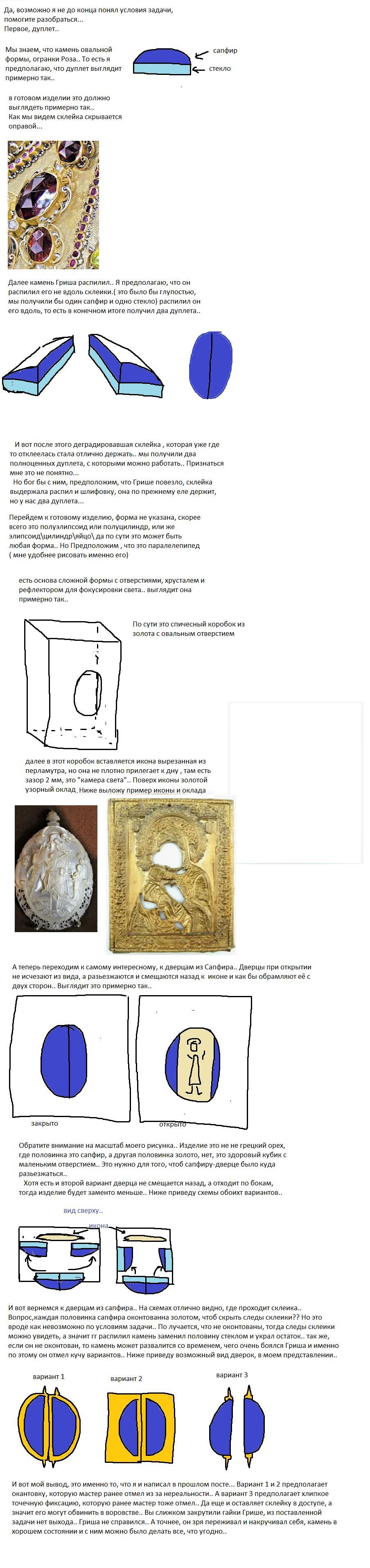 То же самое по поводу "склейки".. Вы подчеркнули, что если в изделии использовать только настоящий сапфир, а стеклянную часть выкинуть, то недоброжелатели скажут, что гг украл часть сапфира, потому, как по документам камень полностью натуральный... Отсюда напрашивается логический вывод, что для обвинения в воровстве врагам плевать, выкинет гг стеклянную часть или использует, его все равно можно обвинить в воровстве.. Повторюсь, какое бы гениальное не было изделие, его можно отдать другому ювелиру, который определит, что это дуплет( тем более он будет знать об этом заранее ) и спросить у гг " а куда же ты, стервец, дел половину сапфира и зачем заменил её стеклом ??? "