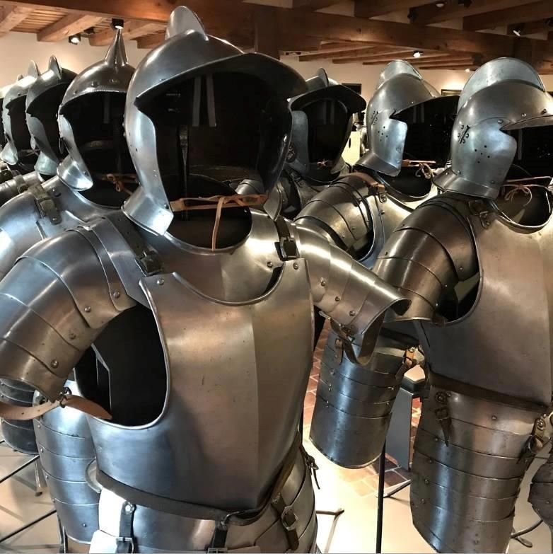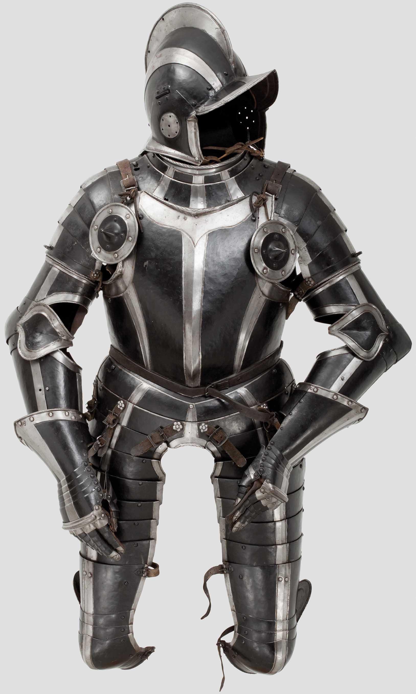Думается мне, что тут на иллюстрации доспех принадлежащий кому-то небедному... Что-то подобное, но с ронделями и наколенниками мне попалось когда-то на просторах интернета и описывалось как чёрно-белый офицерский доспех
