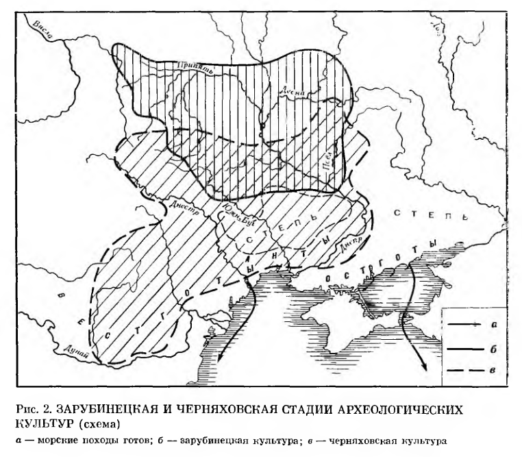 2. логическими рассуждениями о том что черняховская культура появилась вместе с готами, и исчезла одновременно с уходом готов. Но это совпадение можно объяснить тем что готы прищучили сарматов и тем самым дали возможность славянским племенам развиваться в степном и лесостепном регионах. Это вызвало миграцию славян назад, из лесов в лесостепь и степь. А гунны своим нашествием одновремено и выдавили готов на запад, и уничтожили черняховскую культуру.