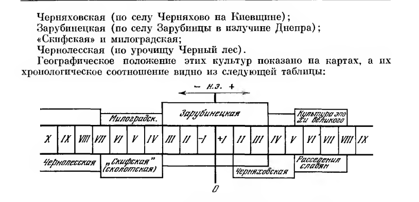 Вот таблица с хронологией разных культур по Б. Рыбакову, видно что Зарубинецкая культура все еще есть