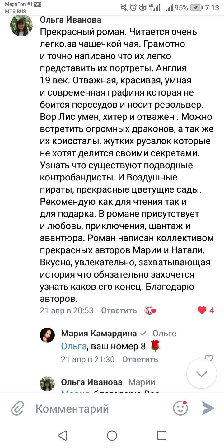 Прекрасный роман. Читается очень легко.за чашечкой чая. Грамотно и точно написано что их легко представить их портреты. Англия 19 век. Отважная, красивая, умная и современная графиня которая не боится пересудов и носит револьвер. Вор Лис умен, хитер и отважен . Можно встретить огромных драконов, а так же их криссталы, жутких русалок которые не хотят делится своими секретами. Узнать что существуют подводные контробандисты. И Воздушные пираты, прекрасные цветущие сады. Рекомендую как для чтения так и для подарка. В романе присутствует и любовь, приключения, шантаж и авантюра. Роман написан коллективом прекрасных авторов Марии и Натали. Вкусно, увлекательно, захватывающая история что обязательно захочется узнать каков его конец. Благодарю авторов. Желаю им дальнейшей совместной работы и процветания!!! Спасибо что Вы у нас есть таке талантливые и красивые.