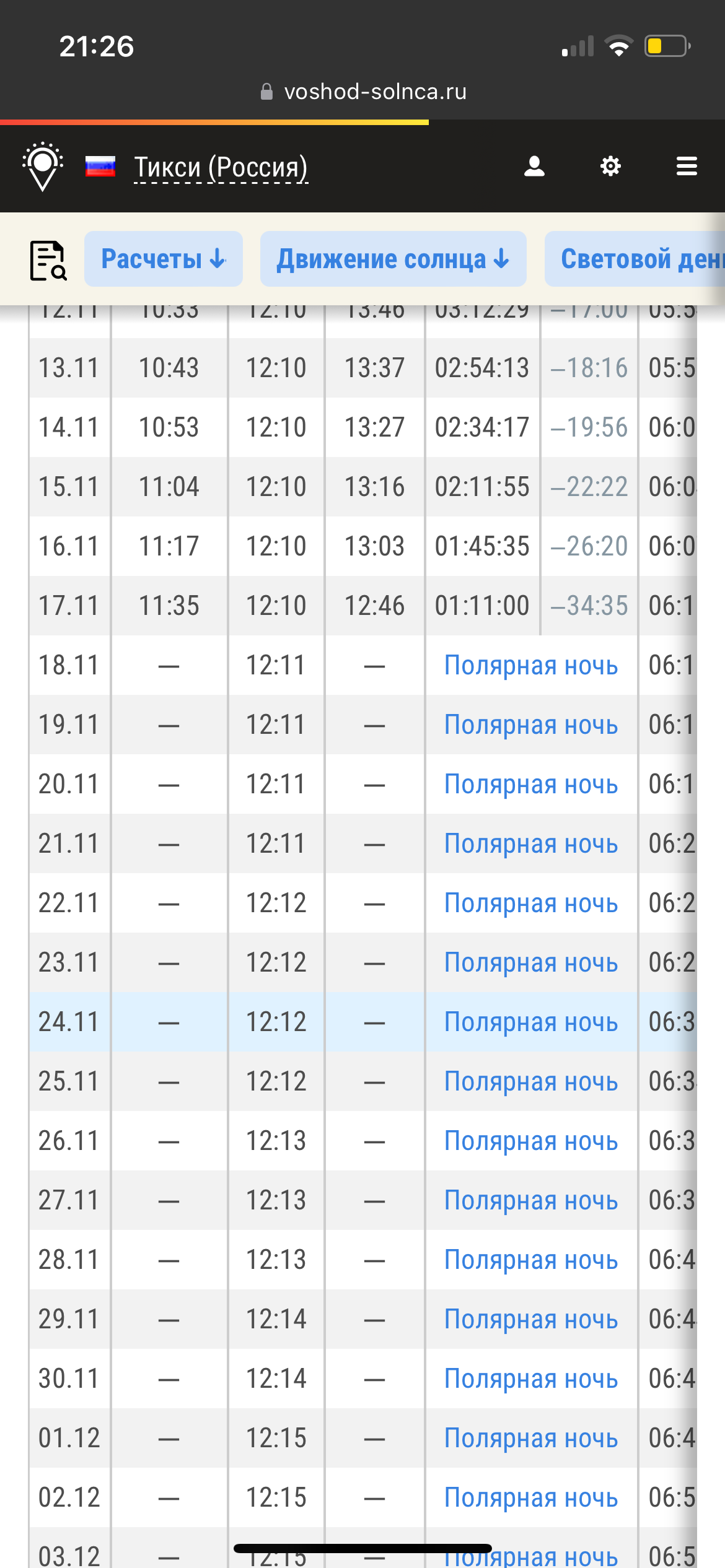 Ну вообще в интернете пишут, что с середины ноября в Тикси полярная ночь.