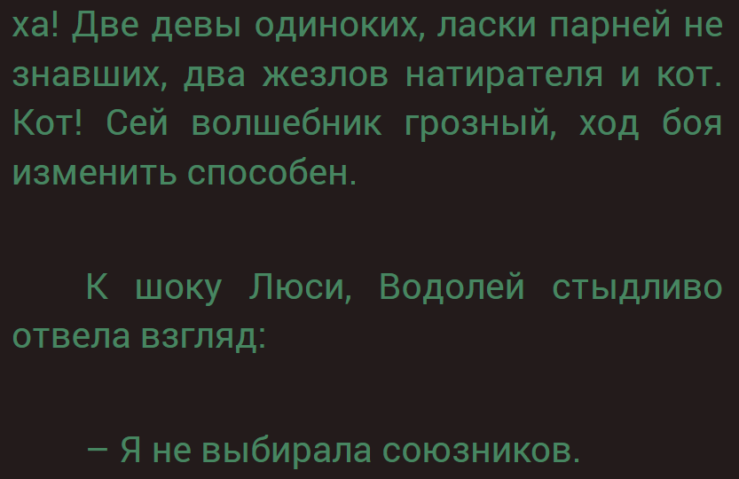 А вообще забавно что группа в телеге выродилась в настоящий литературный клуб в лучших традициях, то есть место где авторы поливают друг друга грязью, истерят, завидуют, сплачиваются против популярных и натирают друг другу ЧСВ вместо того чтобы стать лучше самим.
