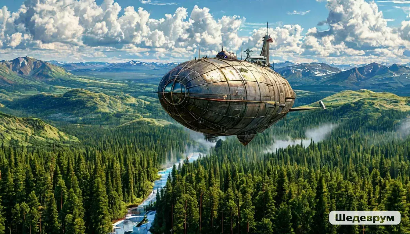 Вселенная КОМ, иллюстрация, высоко над сибирской тайгой пролетает огромный дирижабль. Вид с верху.