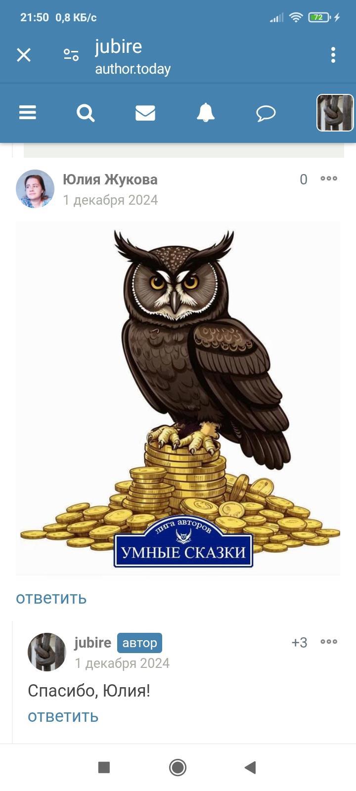 Ну вот, а я все ваши книги , Салмы, Таты ( ещё когда была tapatunya), Татьяны Солодковой, приобретала на Л-те, а не здесь. Всё давно прочитано! Но недавно за пять книг Юлии Жуковой получила от неё сову!