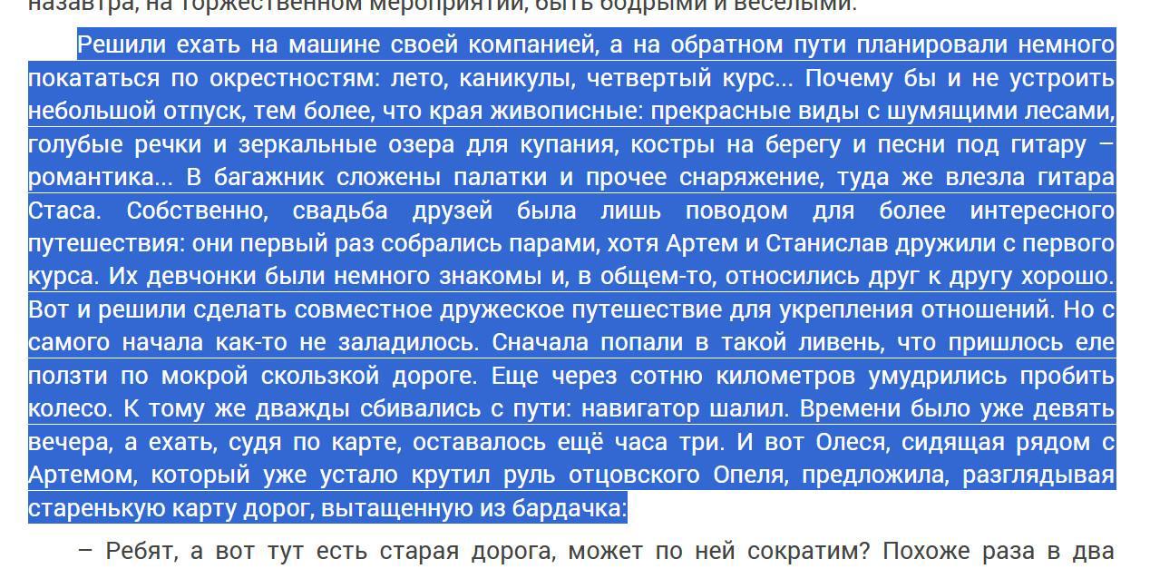 Решили ехать на машине своей компанией, а на обратном пути планировали немного покататься по окрестностям: лето, каникулы, четвертый курс... Почему бы и не устроить небольшой отпуск, тем более, что края живописные: прекрасные виды с шумящими лесами, голубые речки и зеркальные озера для купания, костры на берегу и песни под гитару – романтика... В багажник сложены палатки и прочее снаряжение, туда же влезла гитара Стаса. Собственно, свадьба друзей была лишь поводом для более интересного путешествия: они первый раз собрались парами, хотя Артем и Станислав дружили с первого курса. Их девчонки были немного знакомы и, в общем-то, относились друг к другу хорошо. Вот и решили сделать совместное дружеское путешествие для укрепления отношений. Но с самого начала как-то не заладилось. Сначала попали в такой ливень, что пришлось еле ползти по мокрой скользкой дороге. Еще через сотню километров умудрились пробить колесо. К тому же дважды сбивались с пути: навигатор шалил. Времени было уже девять вечера, а ехать, судя по карте, оставалось ещё часа три. И вот Олеся, сидящая рядом с Артемом, который уже устало крутил руль отцовского Опеля, предложила, разглядывая старенькую карту дорог, вытащенную из бардачка