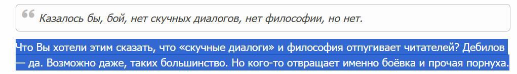 Я ему про Фому, он мне про Ерему. С такими примерами рождаемость не поднимешь и целину не вспашешь. А и про ваше творчество и молчаливое чтение можно сказать "ай ай ай". Мой пост выше все это уже расписал. Вы по сути загубили все то чем ценилось писание веб романов. И обманули ожидание большинства нормальный адекватных писателей. Вы уже "оплатили эту самую квартиру бабушке" своим молчанием. И с этим даже параллелей проводить не нужно. Но для вас: