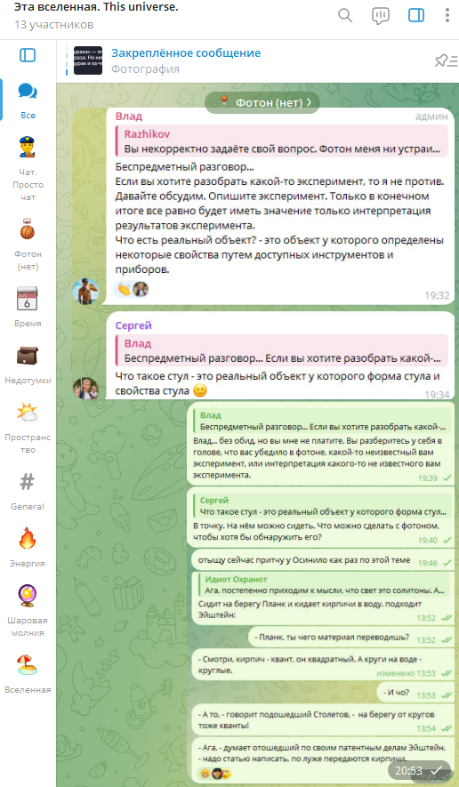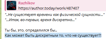 "Неопределённость Гейзенберга, квантование действия, постоянная Планка, — вот это вот всё, да. Они с сериозными лицами рассуждают о пространстве Минковского, — это там, где ось времени на равных правах с осями X, Y, Z. Не стопка нарезанных кадров, а вот прям такая же. И поехали о путешествиях во времени...