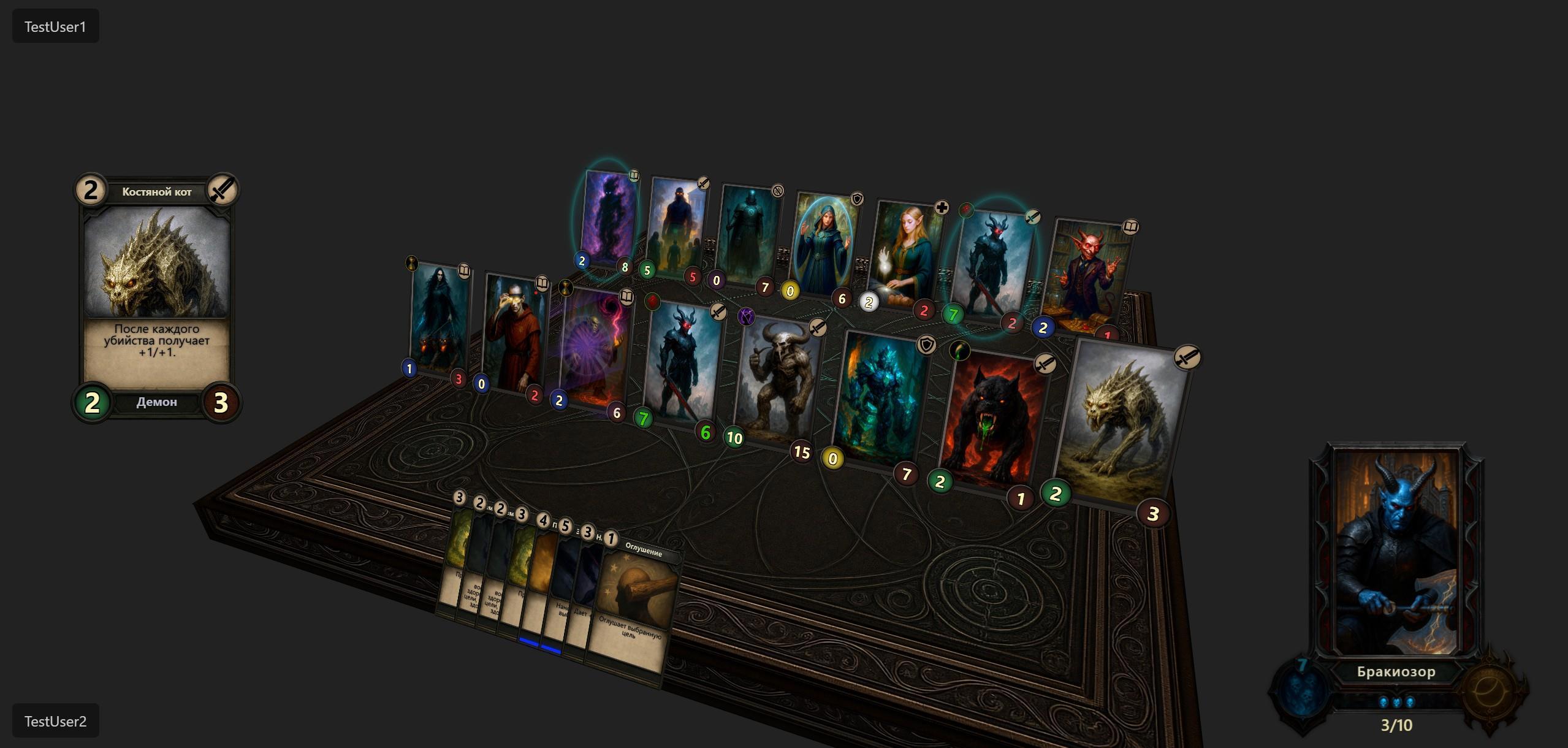 Почти все базовые механики Hearthstone реализованы, и добавлены парочку новых.