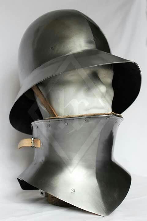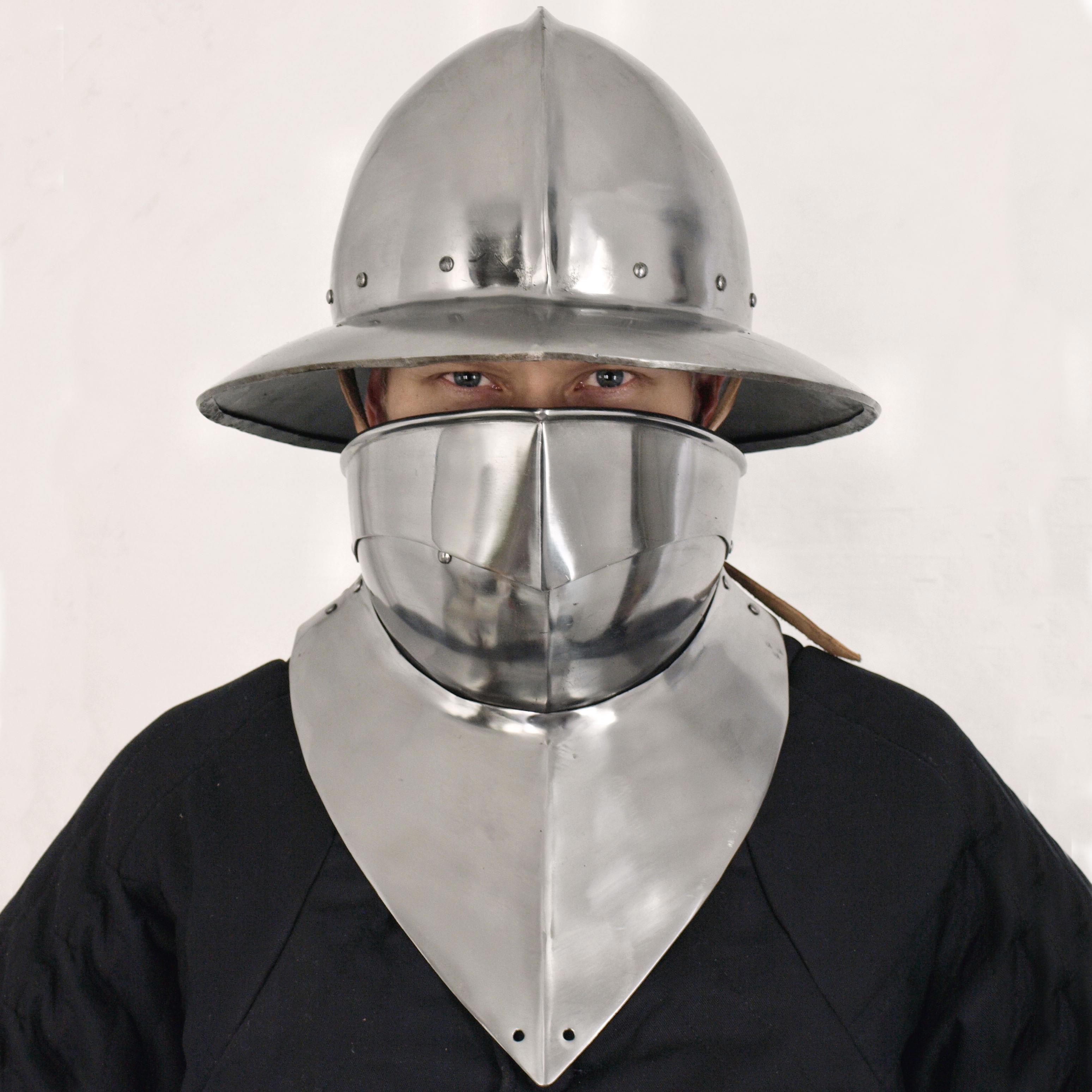 С шапелиной, часто использовали стальной горжет, который поднимался чуть ли не до уровня носа. При таком раскладе, наклон головой вперед, закрывал полями лицо, защищая от опасности. Получалось, что нижняя часть лица закрыта горжетом, верхняя шапелиной. При этом открыться, осмотреться и закрыться вновь, дело одного мгновения. Можно держать узкую прорезь.