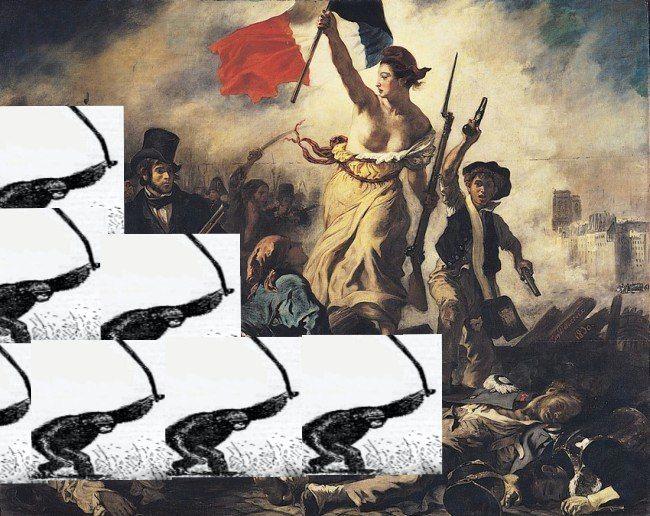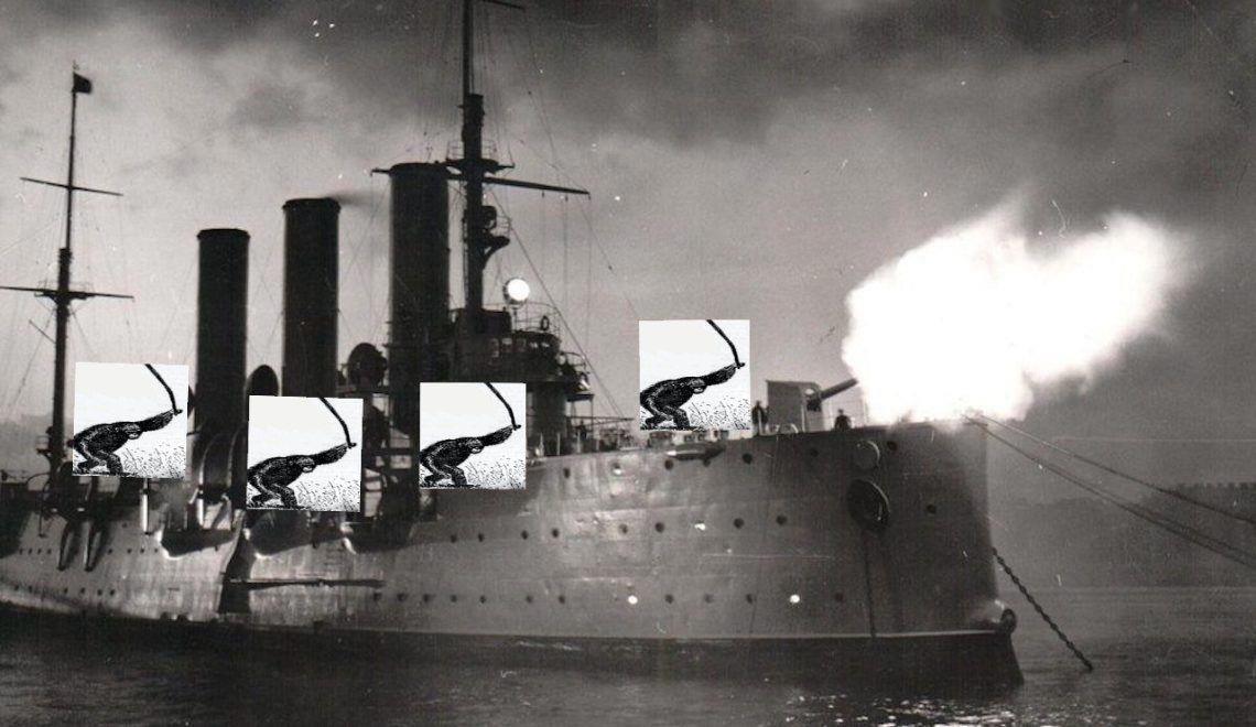 Крейсер "Аврора" с бундовщиками даёт залп по "Зимнему дворцу", изгоняя газовщиков и дражайшую маму жены).