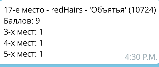 Для любопытствующих авторов, кто тоже ходит по конкурсам: 17е место из 40ка рассказов. Чтобы выйти в финал, нужно было занять 12е место.
