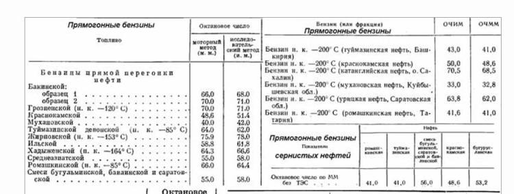 вот нашел довоенные данные испытаний прямогонных бензинов СССР,в зависимости от места получения октановое число гуляет от 33до 78, сокращения "к.к." это "конец кипения" образца (показывает какие фракции отбирали из нефти), то есть можно отбирать высокооктановые образцы и маркировать их каким нибудь цветом, как в послевоенном СССР, и тогда можно применять двигатели с разной степенью сжатия.