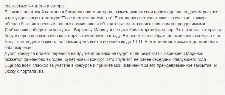 Ладно уж, давайте не будем поддаваться упадническим настроениям. Будем работать - результат появится, не зря ж говорят, что под лежачий камень вода не течёт. Так что, успехов вам на новой площадке. А за конкурсом можно понаблюдать, всё же надежда на адекватность администрации ЛЭ пока есть.