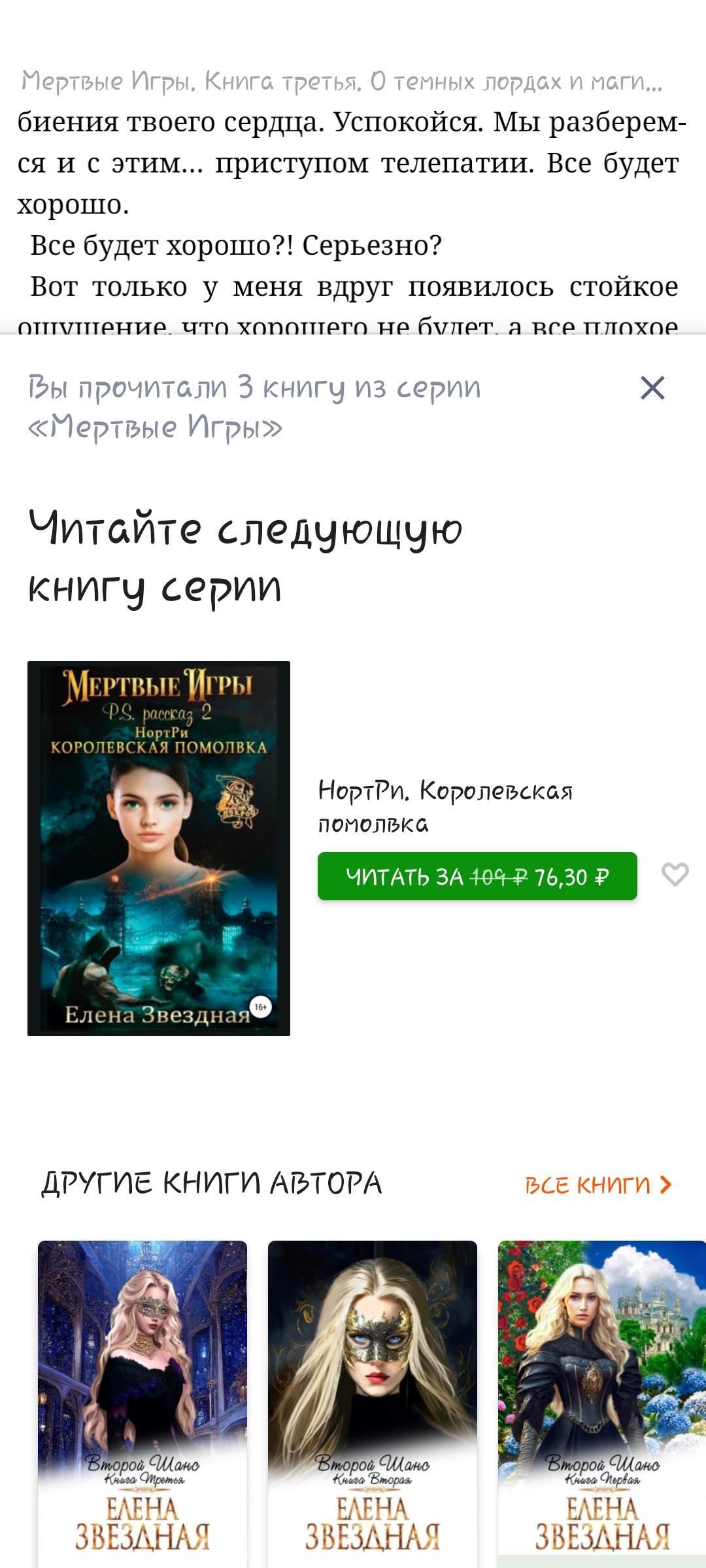 Дорогой автор, причём действительно дорогой, ваши электронные книги стоят, как у многих других печатные. И знаете я никогда не обращала на это внимание до сегодняшнего дня. Я купила первые три книги на Литрес. (Ваш личный сайт Мне кажется не удобным.) Прочитав книге Там я пришла сюда за четвёртой частью и поняла что это просто Небо и земля у вас на разных сайтах выложены разные версии книг!!! И получается что за одну и ту же часть Я заплатила два раза просто чтобы понять что происходит!