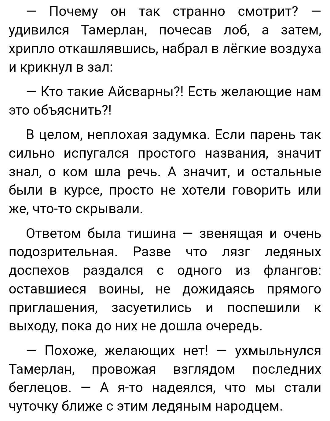 А вот тут (33 книга, 20 глава) Тамерлан тоже просто кричит, но его не понимают и просто так сваливают, а не испугавшись его слов об Айсварнах? Просто рассуждения ГГ тут таковы, будто он ожидает, что Тамерлана все поняли, только отвечать боятся.