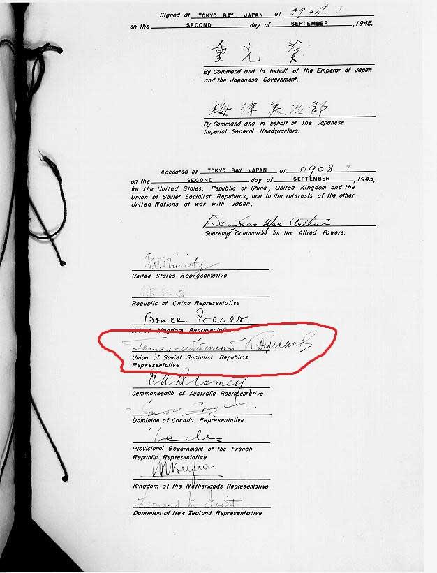 Ну и ещё тобой была написана одна типичная ложь, характерная для антисоветчиков - акт о безоговорочной капитуляции перед СССР Японская империя подписывала, там же, где и перед остальными - на линкоре "Миссури". С советской стороны её принимал генерал-лейтенант Деревянко.